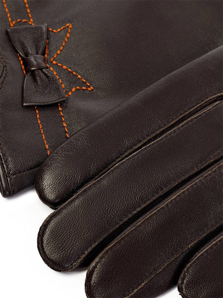 Перчатки женские торговой марки LABBRA производства Китай. Выполнены из натуральной кожи ягненка. Подкладка - 70% шерсть, 30% акрил. Отделка - отстрочка ниткой контрастного цвета в форме банта.  Длина манжеты от нижней точки большого пальца до края перчаток - 5 см. Длина пальцев - средняя.