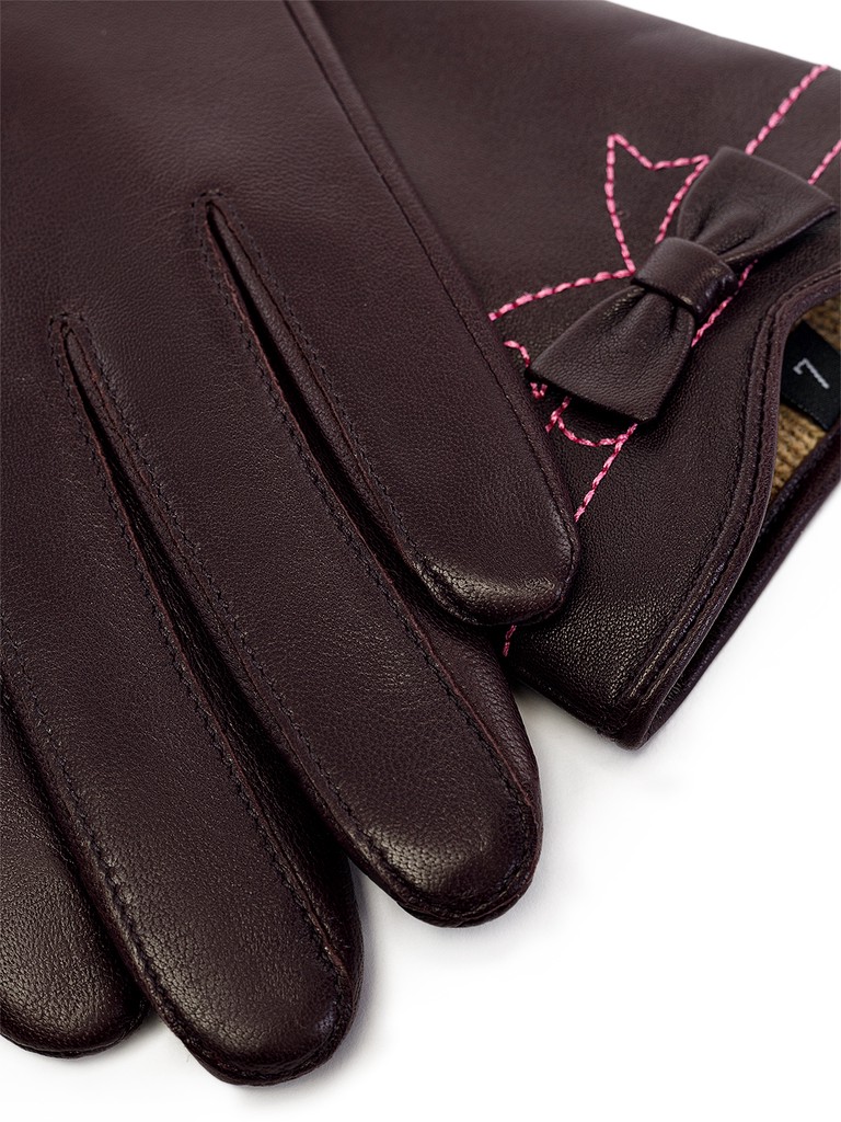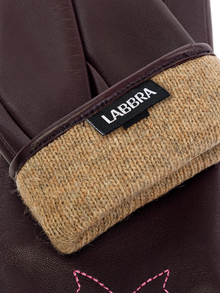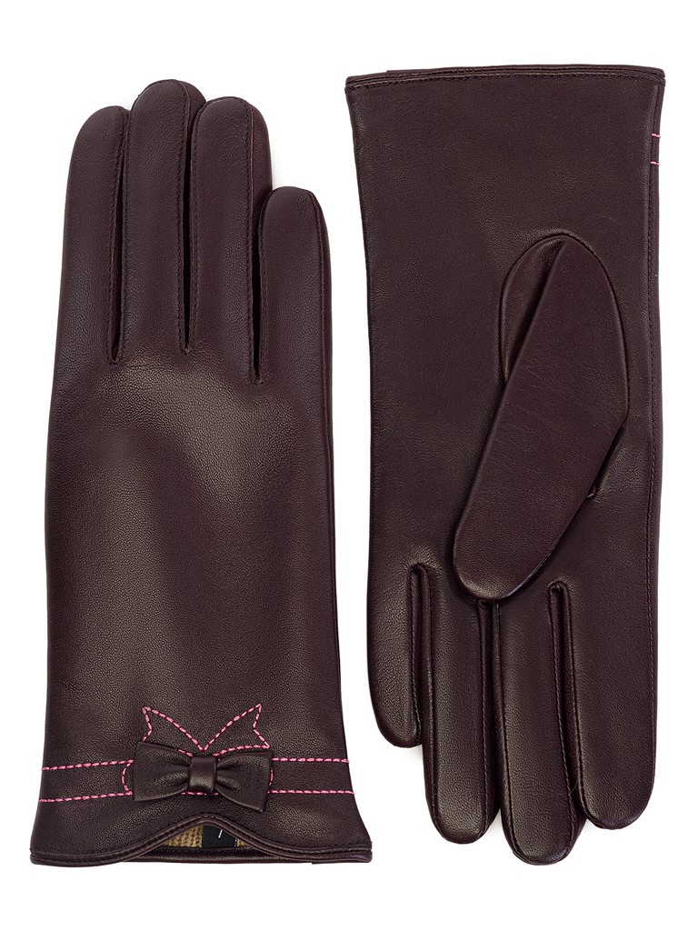 Перчатки женские торговой марки LABBRA производства Китай. Выполнены из натуральной кожи ягненка. Подкладка - 70% шерсть, 30% акрил. Отделка - отстрочка ниткой контрастного цвета в форме банта.  Длина манжеты от нижней точки большого пальца до края перчаток - 5 см. Длина пальцев - средняя.