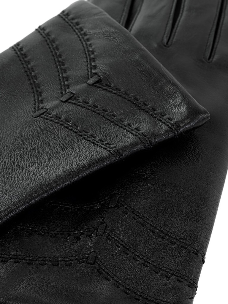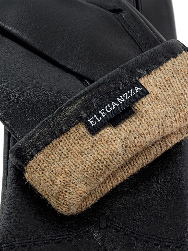 Перчатки торговой марки ELEGANZZA производства Китай выполнены из натуральной кожи ягнёнка. Подкладка: 100% шерсть. Отделка - декоративная отстрочка  V-образной формы по линии манжета, украшена продежками из тонкго кожаного шнурка. Длина манжеты от нижней точки большого пальца до края перчаток - 5,5 см. Длина пальцев - средняя.