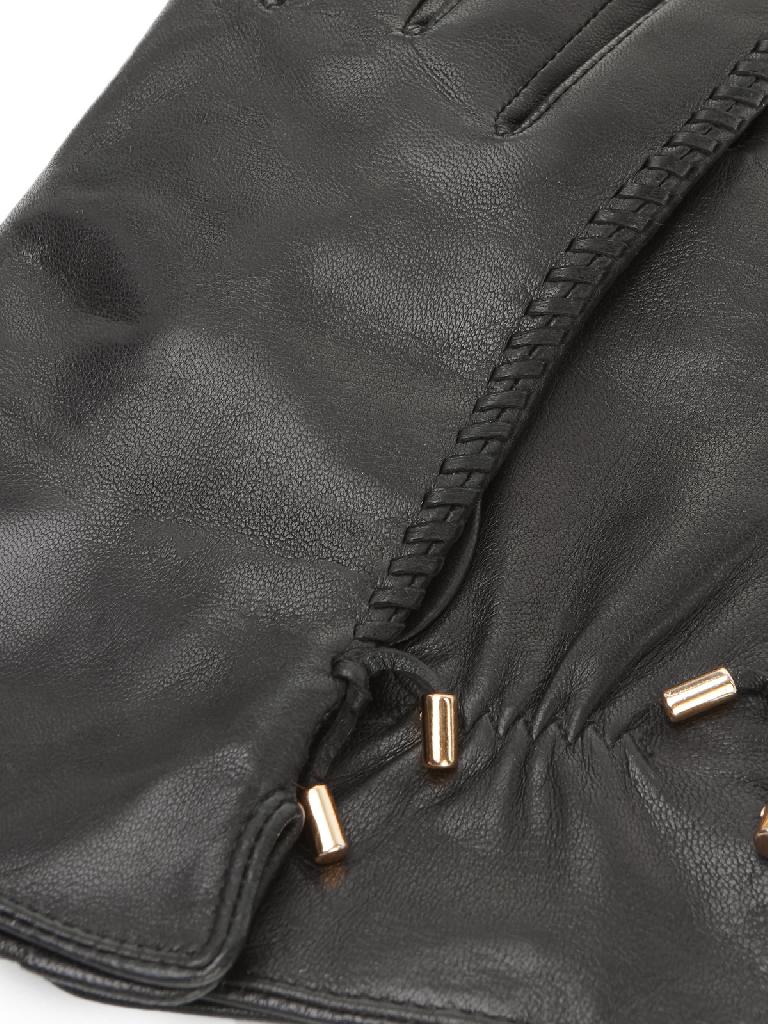 Перчатки женские торговой марки ELEGANZZA из натуральной кожи ягненка. Производство Китай. Подкладка: 100% шерсть. Отделка - продежка тонким кожаным шнурком по краю перчатки, кожаный шнурок украшен фурнитурой, имеется разрез на манжете. Длина манжеты от нижней точки большого пальца до края перчаток - 6 см. Длина пальцев - удлиненные.