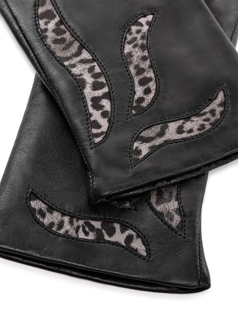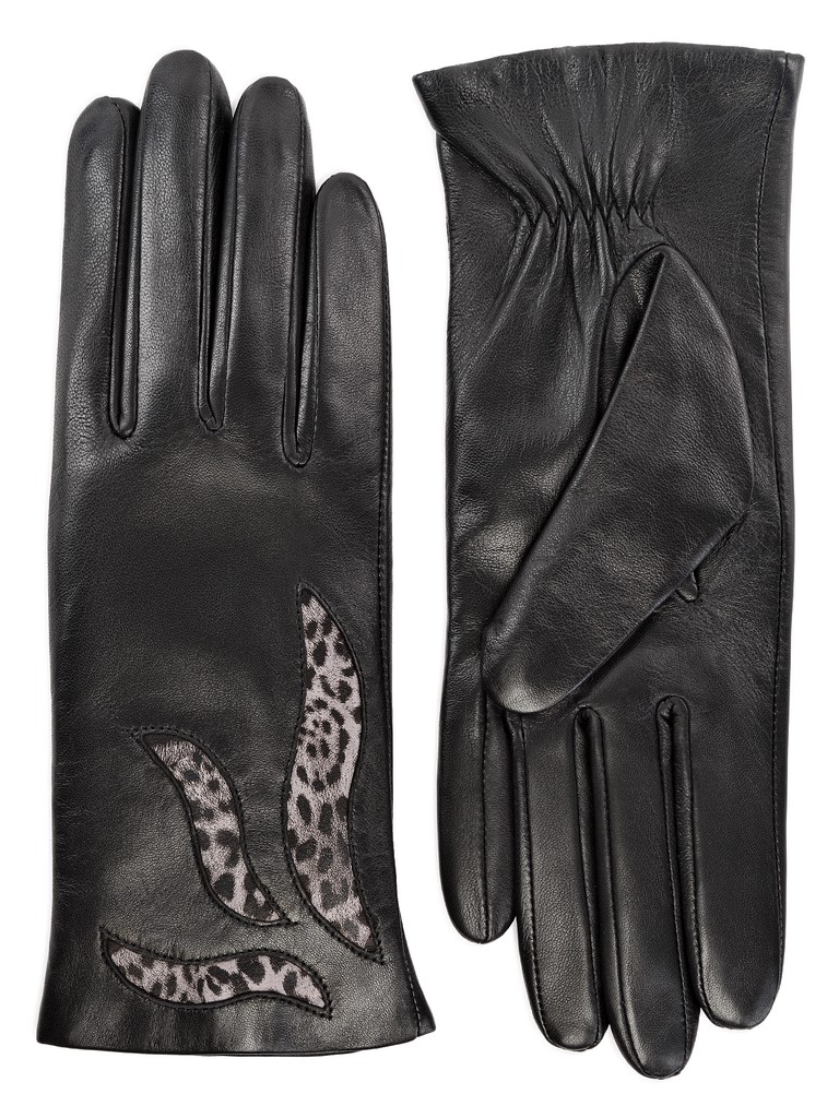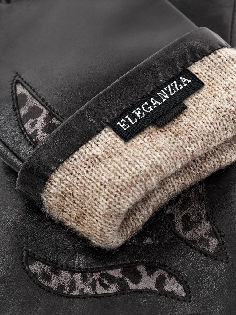 Перчатки женские торговой марки ELEGANZZA из натуральной кожи ягненка. Производство Китай. Подкладка: 100% шерсть. Отделка - фигурные прорези с контрастными леопардовыми вставками из принтованной кожи на лицевой стороне.  Длина манжеты от нижней точки большого пальца до края перчаток - 5 см. Длина пальцев - средняя.