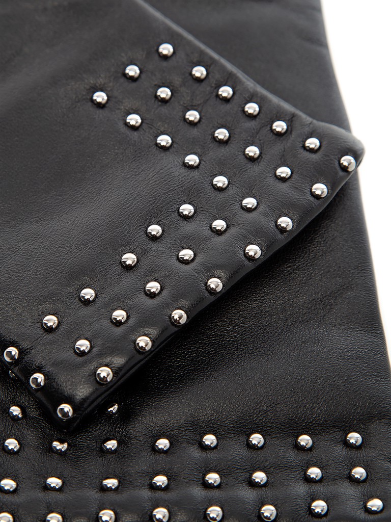 Перчатки женские торговой марки LABBRA производства Китай. Выполнены из натуральной кожи ягненка. Подкладка - 70% шерсть, 30% акрил. Декоративная отделка металлическими хольнитенами по линии манжеты перчатки. Длина манжеты от нижней точки большого пальца до края перчаток - 6 см. Длина пальцев - средняя.