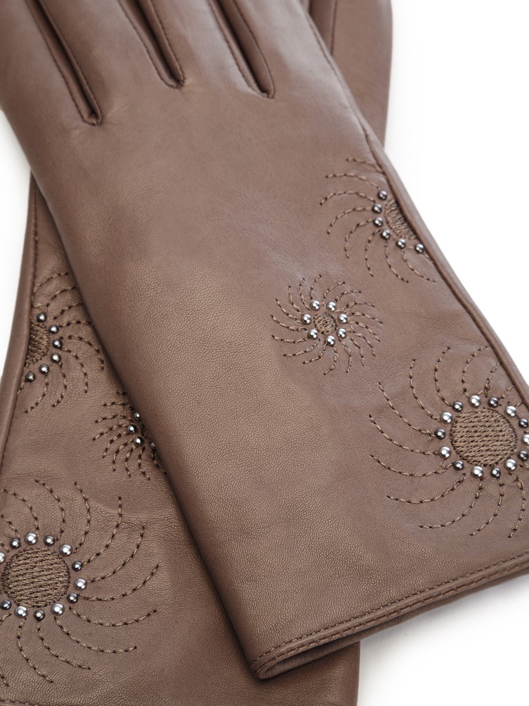 Перчатки женские торговой марки ELEGANZZA производства Китай изготовлены из натуральной кожи ягненка. Подкладка: 70% шерсти, 30% кашемира. Отделка - декоративные цветочные строчки по лицевой части перчатки, украшенные маленькими хольнитенами цвета светлое золото и никель. Длина манжеты от нижней точки большого пальца до края перчаток - 5 см. Длина пальцев - средняя.