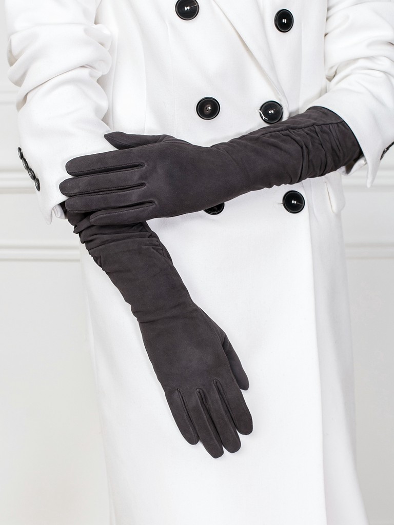 Перчатки торговой марки ELEGANZZA производства Италия выполнены из натуральной замши. Имеет декоративную сборку на манжете. Подкладка: 85% шерсть, 15%кашемир. Длина манжеты от нижней точки большого пальца до края перчаток - 23,5 см. Пальцы - средне-удлиненные.