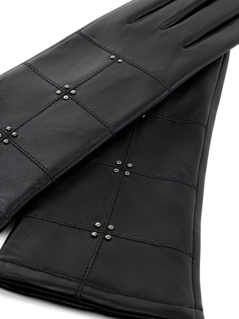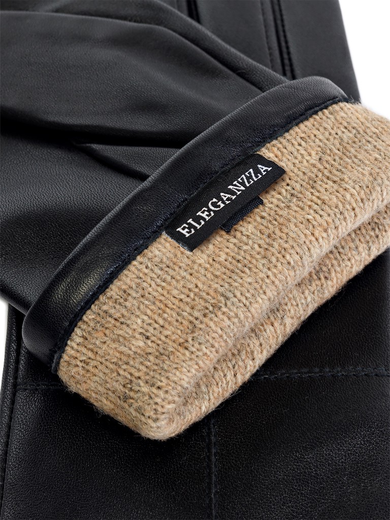Перчатки торговой марки ELEGANZZA производства Китай выполнены из натуральной кожи ягненка. Подкладка: 100% шерсть. Отделка - декоративная отстрочка геометрической формы на лицевой части, украшенная хольнитенами. Длина манжеты от нижней точки большого пальца до края перчаток - 6 см. Длина пальцев - средняя.