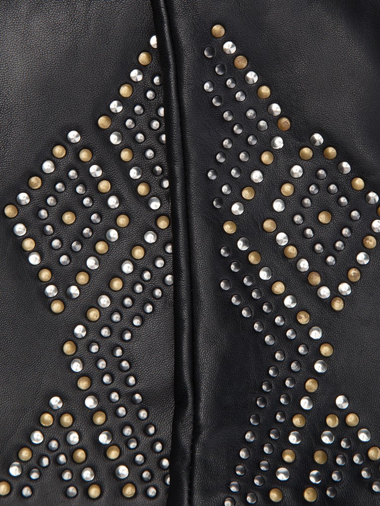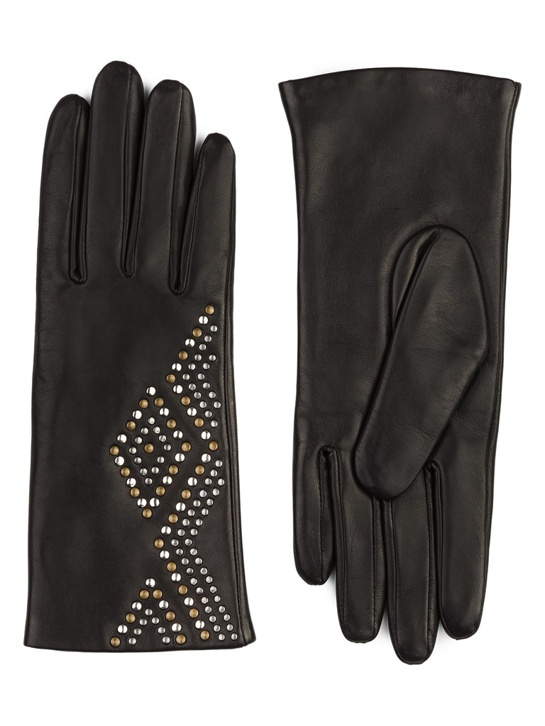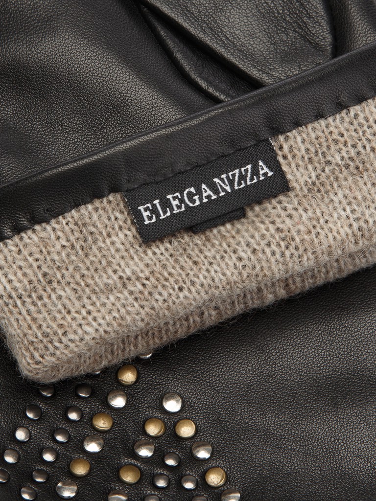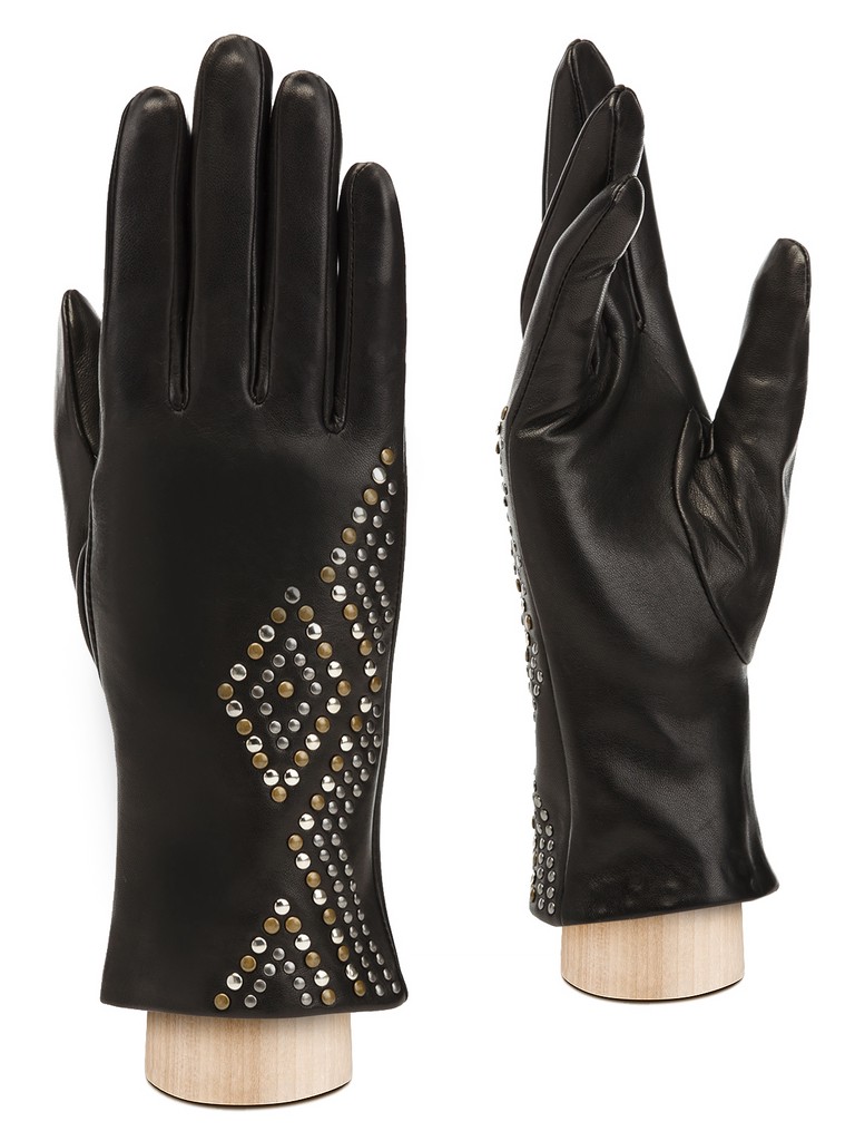 Перчатки женские торговой марки ELEGANZZA из натуральной кожи ягненка. Производство Китай. Подкладка: 100% шерсть. Отделка - декоративные хольитены разного цвета и размера на лицевой части, выложенные в виде ромбов. Длина манжеты от нижней точки большого пальца до края перчаток - 6 см. Длина пальцев - средняя.