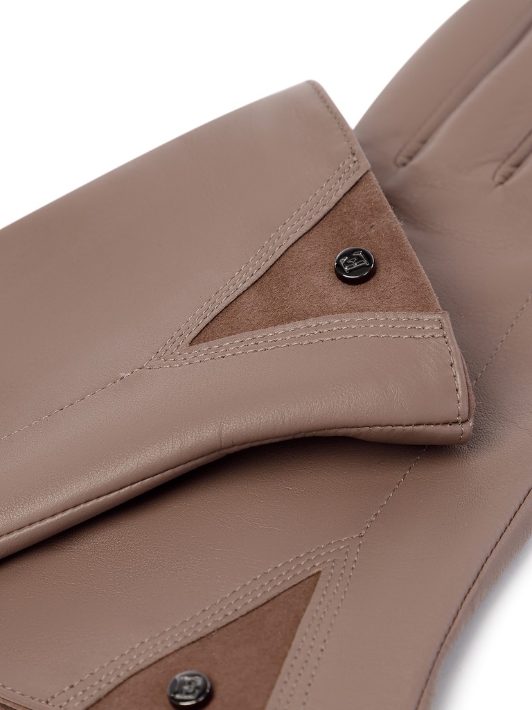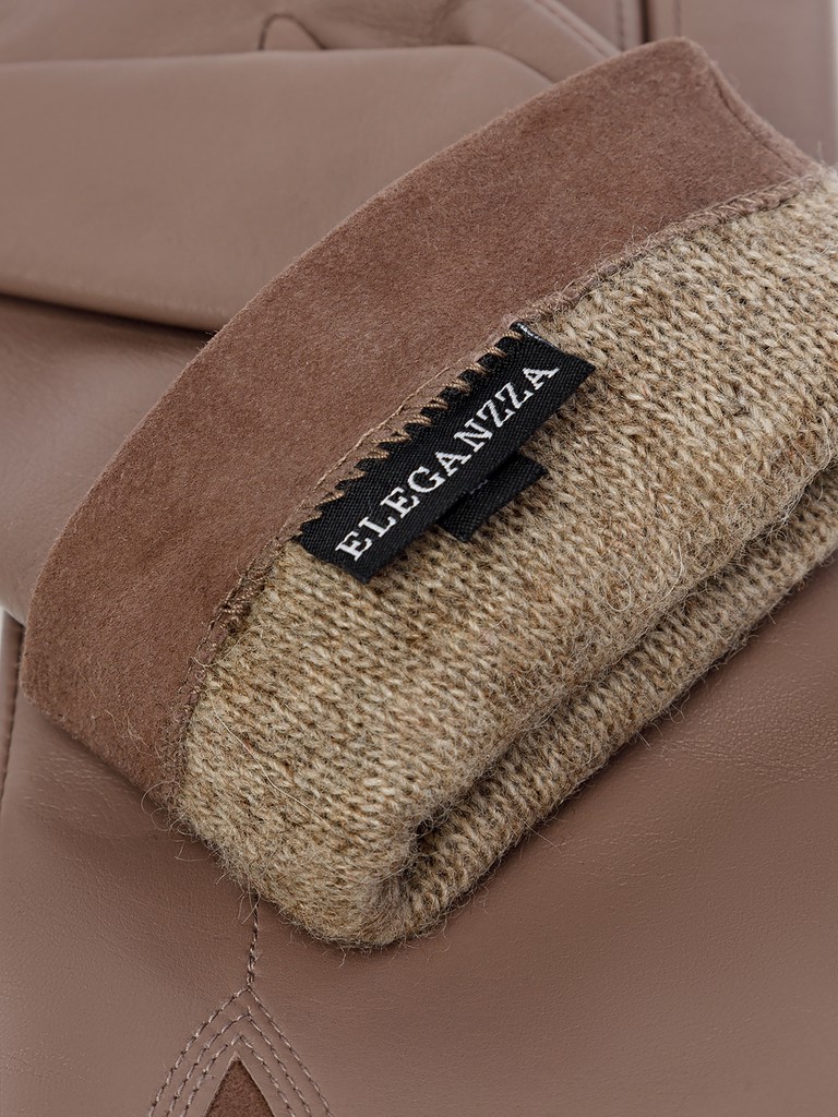Перчатки торговой марки ELEGANZZA производства Китай, изготовлены из натуральной кожи ягненка. Подкладка: 70% шерсти, 30% кашемира. Лицевая часть перчатки украшена декором треугольной формы из натурального велюра, фирменной фурнитурой  и декоративной отстрочкой. Длина манжеты от нижней точки большого пальца до края перчаток составляет - 5 см. Длина пальцев - средняя.