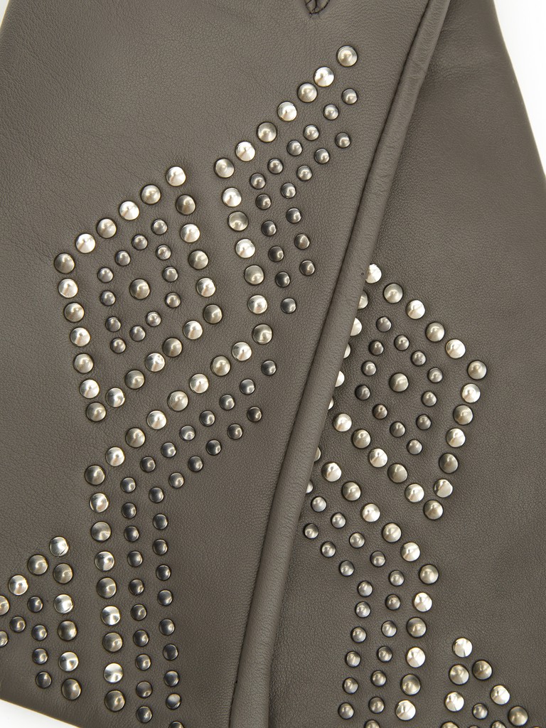 Перчатки женские торговой марки ELEGANZZA из натуральной кожи ягненка. Производство Китай. Подкладка: 100% шерсть. Отделка - декоративные хольитены разного цвета и размера на лицевой части, выложенные в виде ромбов. Длина манжеты от нижней точки большого пальца до края перчаток - 6 см. Длина пальцев - средняя.