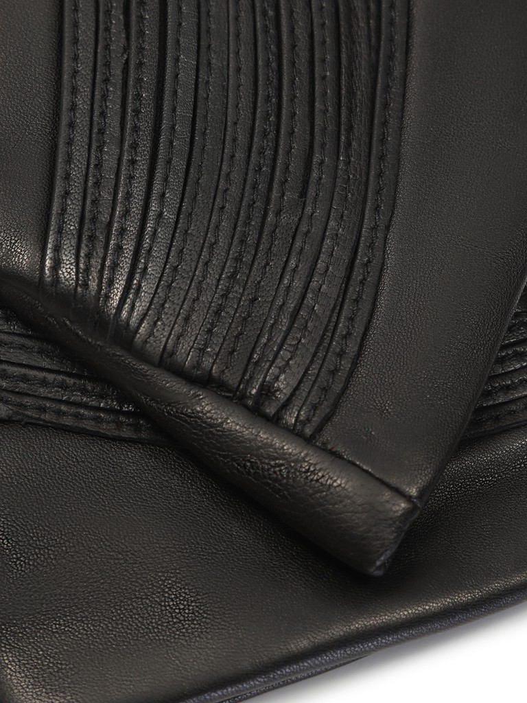 Перчатки торговой марки ELEGANZZA производства Китай выполнены из кожи ягнёнка. Подкладка: 100% шерсть. Отделка - декоративные узкие кожаные шнурки, которые крепятся в шов, имитируют браслет на запястье. На ладонной стороне широкая резинка. Длина манжеты от нижней точки большого пальца до края перчаток - 8,5 см. Длина пальцев - средняя.