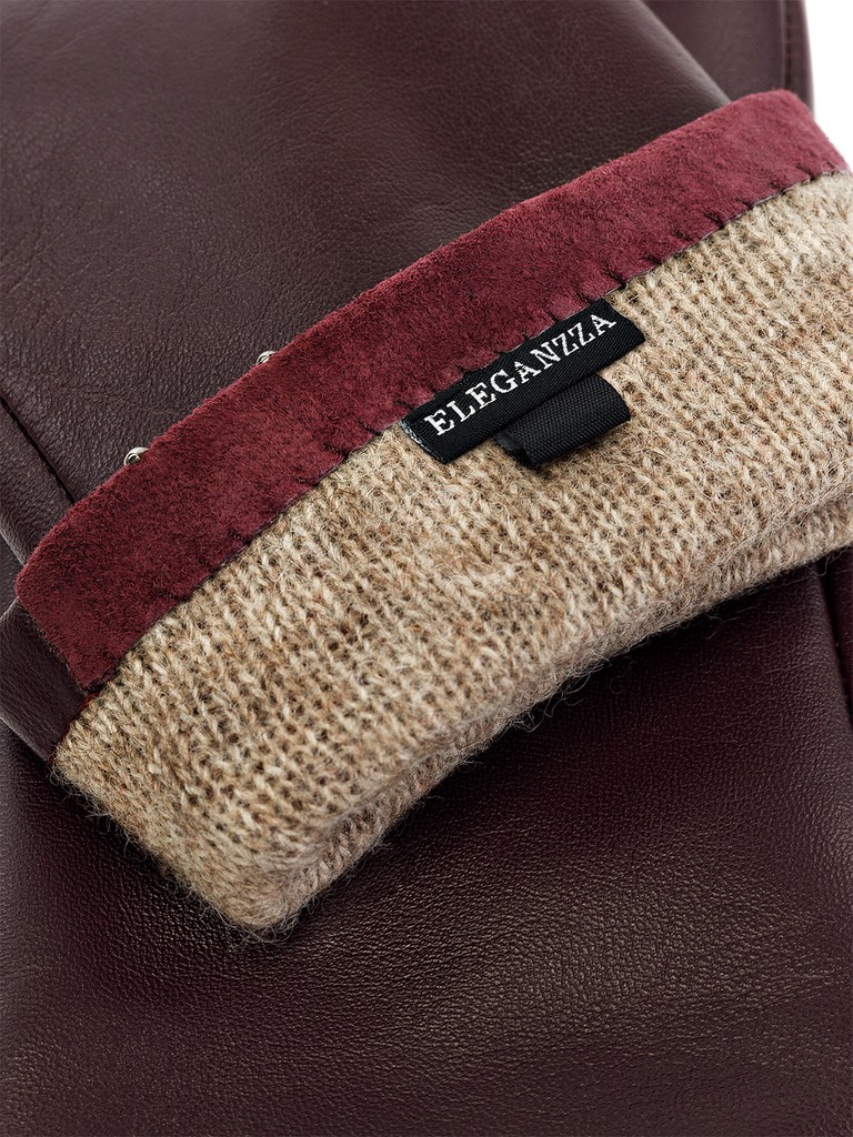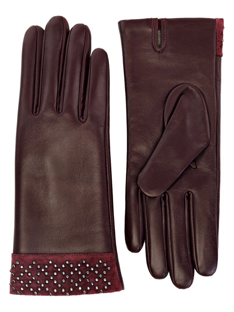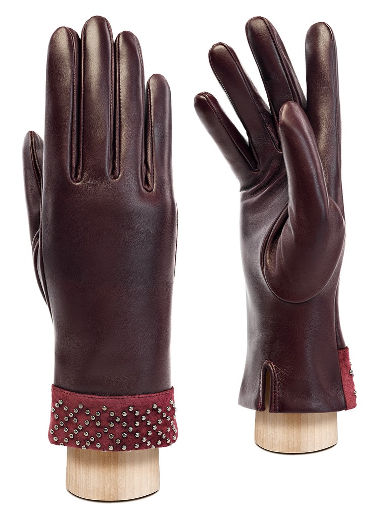 Перчатки женские торговой марки ELEGANZZA из натуральной кожи ягненка. Производство Китай. Подкладка: 100% шерсть. Отделка - манжет из натурального велюра в тон, украшенного раскладкой из хольнитенов с имитацией браслета. Разрез на ладонной части. Длина манжеты от нижней точки большого пальца до края перчаток - 6 см. Длина пальцев - средняя.
