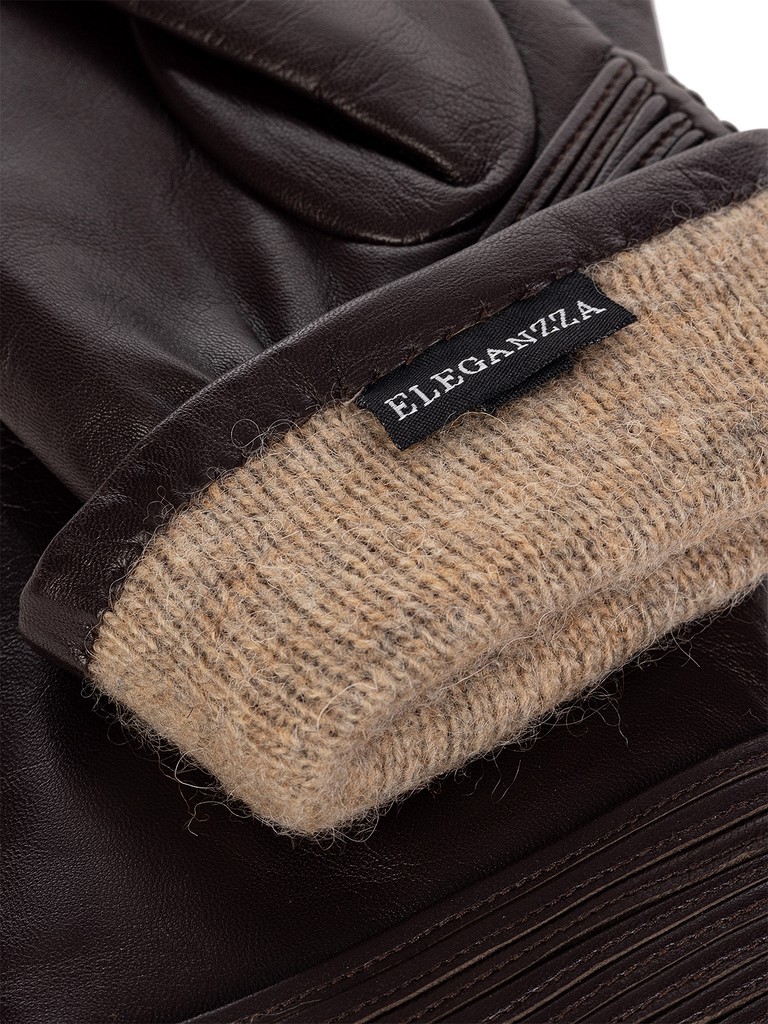 Перчатки торговой марки ELEGANZZA производства Китай выполнены из кожи ягнёнка. Подкладка: 100% шерсть. Отделка - декоративные узкие кожаные шнурки, которые крепятся в шов, имитируют браслет на запястье. На ладонной стороне широкая резинка. Длина манжеты от нижней точки большого пальца до края перчаток - 8,5 см. Длина пальцев - средняя.