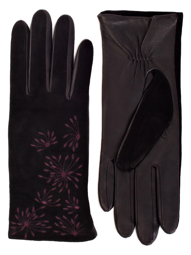 Перчатки женские торговой марки ELEGANZZA из натуральной итальянской кожи ягненка и натурального велюра на лицевой части.  Подкладка: 85% шерсть + 15% кашемир. Отделка - декоративная  вышивка в цветочной тематике. Длина манжеты от нижней точки большого пальца до края перчаток - 6,5 см. Длина пальцев - средняя.