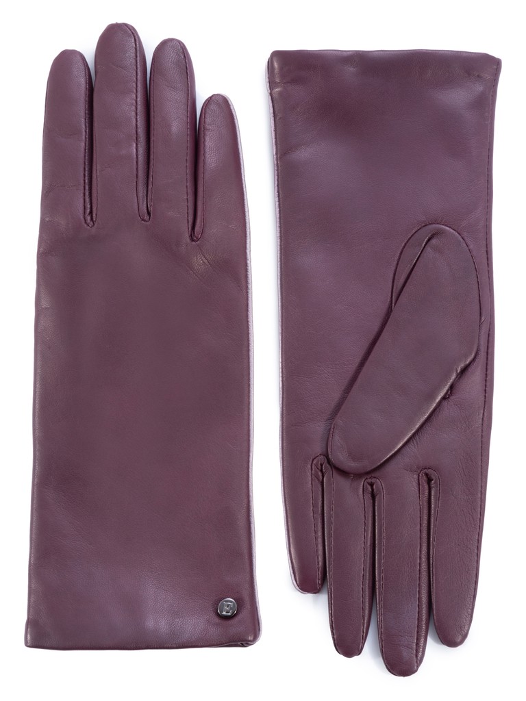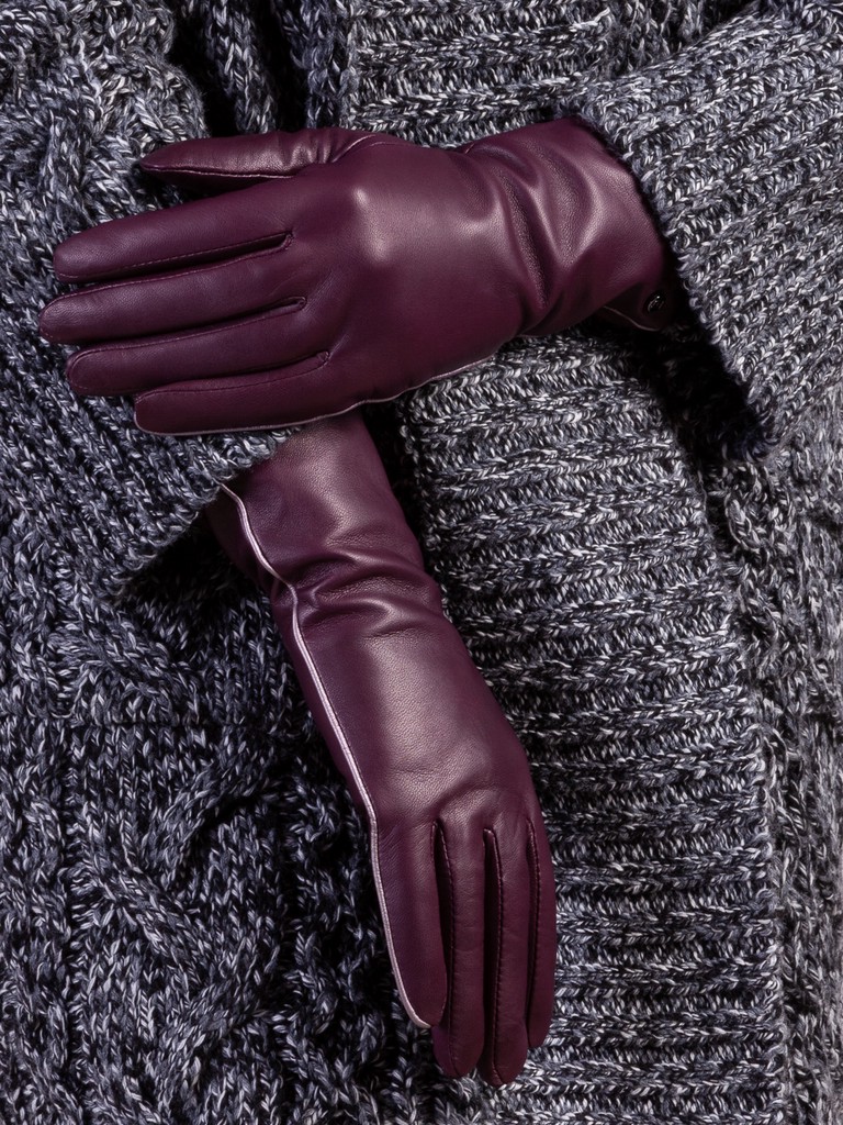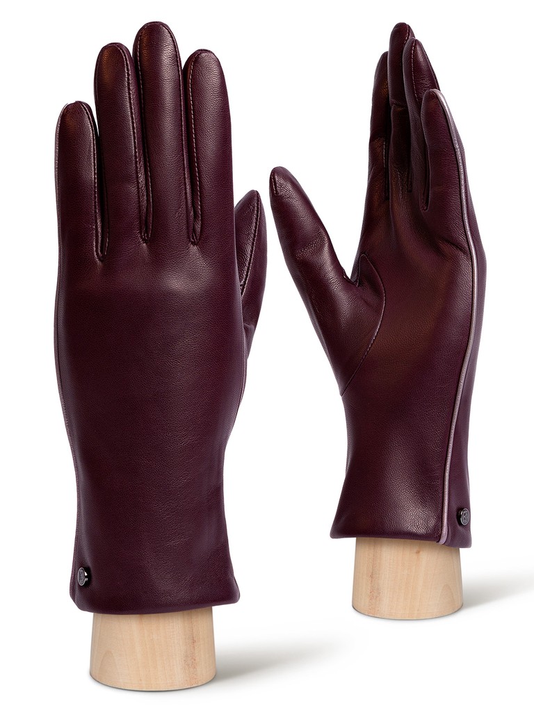 Перчатки женские торговой марки ELEGANZZA из натуральной кожи ягненка. Производство Италия. Подкладка: 85% шерсть, 15% кашемир. Отделка - по шву вдоль мизинца добавлен декоративный кант из кожи с перламутровым эффектом; в углу перчатки фирменная фурнитура. Длина манжеты от нижней точки большого пальца до края перчаток - 7 см. Длина пальцев - средняя.