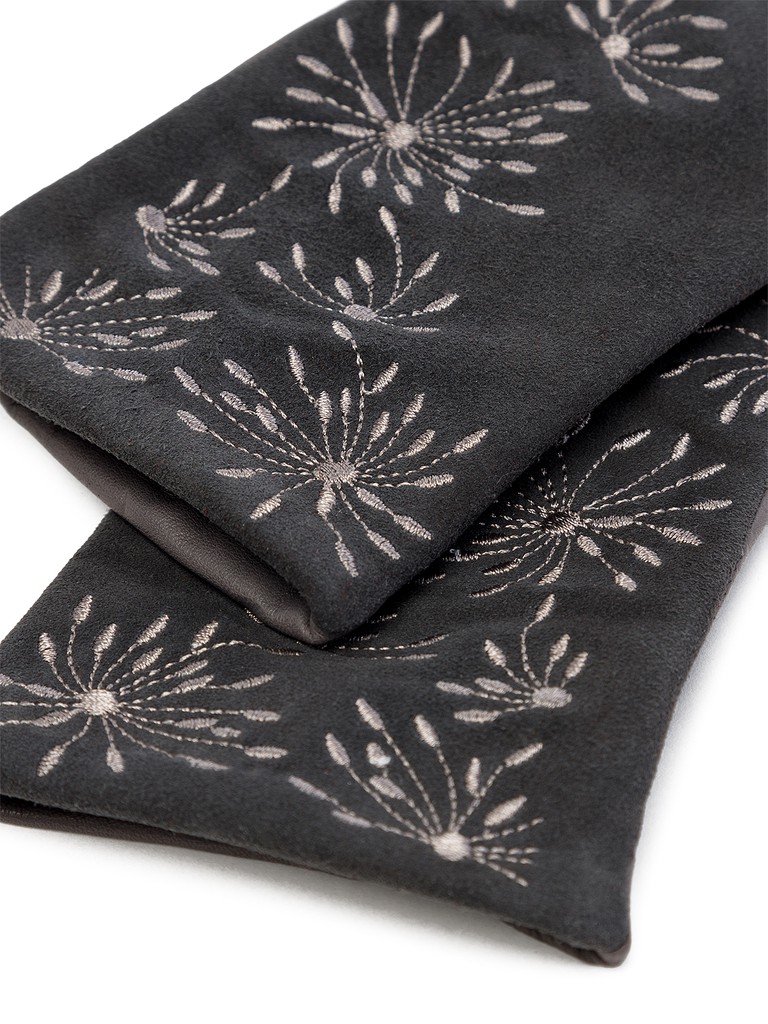 Перчатки женские торговой марки ELEGANZZA из натуральной итальянской кожи ягненка и натурального велюра на лицевой части.  Подкладка: 85% шерсть + 15% кашемир. Отделка - декоративная  вышивка в цветочной тематике. Длина манжеты от нижней точки большого пальца до края перчаток - 6,5 см. Длина пальцев - средняя.