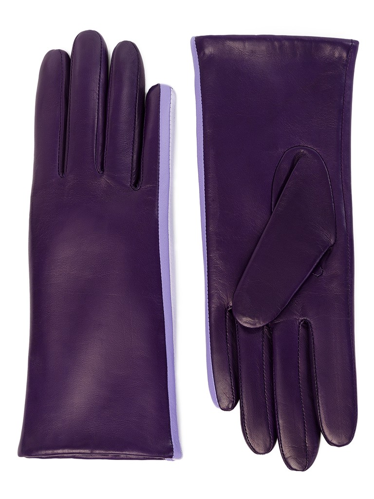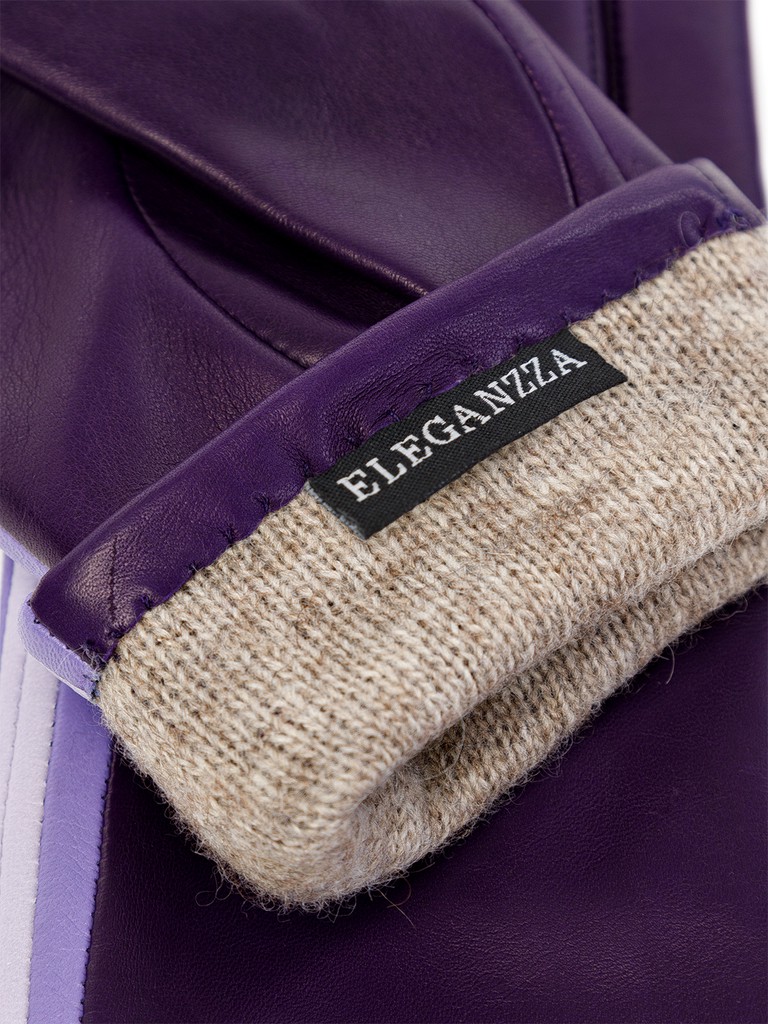 Перчатки женские торговой марки ELEGANZZA из натуральной кожи ягненка. Производство Италия. Подкладка: 85% шерсть, 15% кашемир. Отделка - контрастные вставки вдоль линии мизинца из натурального велюра и кожи. Длина манжеты от нижней точки большого пальца до края перчаток составляет - 6 см. Длина пальцев - средняя.
