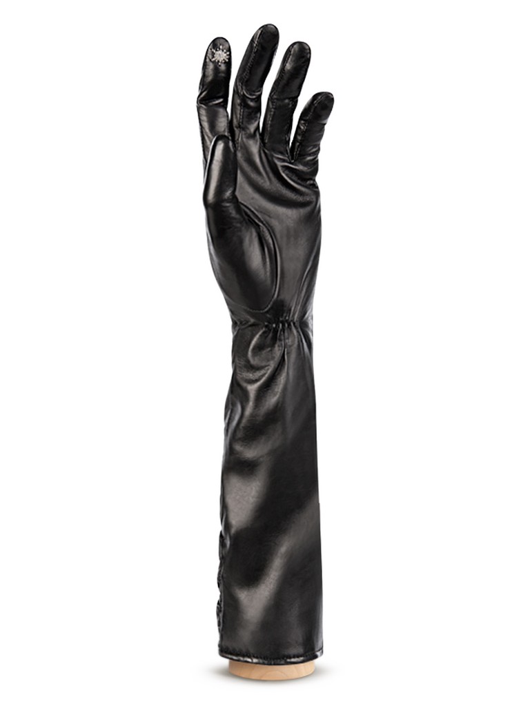 Перчатки торговой марки ELEGANZZA производства Италии изготовлены из натуральной кожи чёрного цвета. Подкладка: 85% шерсти, 15% кашемира. Декоративные элементы - в боковых швах сборки. Данная модель позволяет работать с сенсорным экраном. Длина манжеты от нижней точки большого пальца до края перчаток составляет - 21 см. Длина пальцев - средняя.
