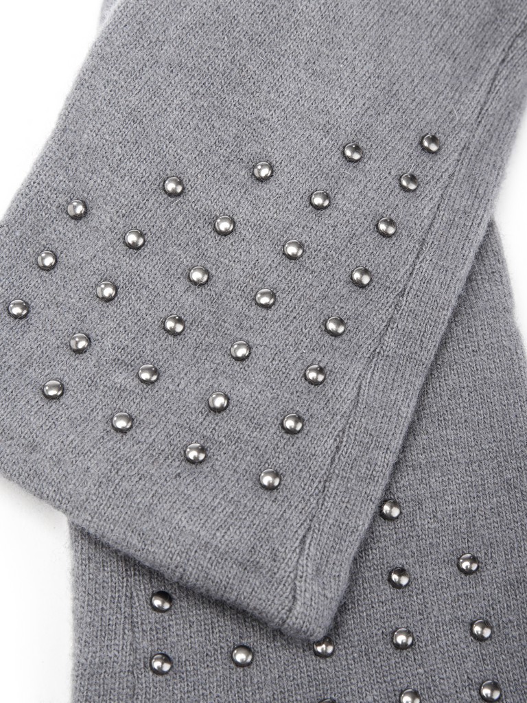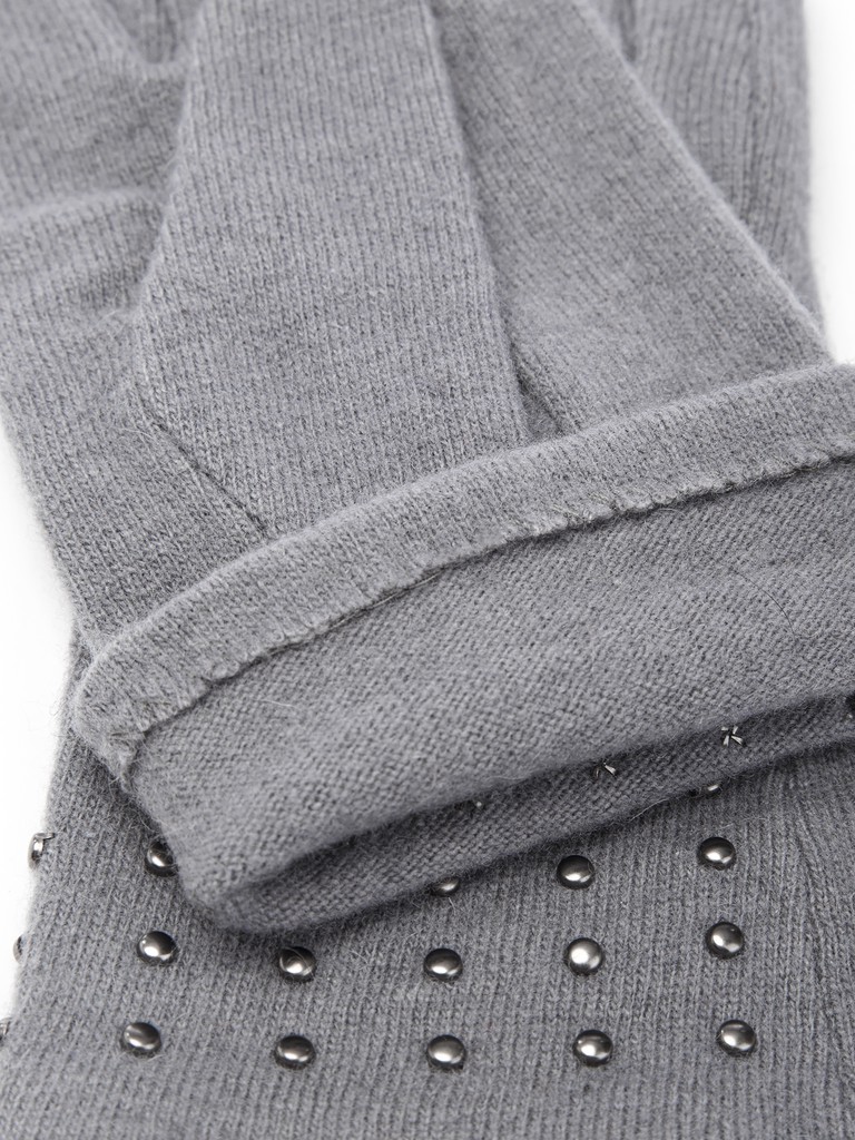 Перчатки торговой марки LABBRA производства Китай выполнены из трикотажной шерсти. Состав трикотажа: 80% шерсть, 20% нейлон. Без подкладки. Отделка - декор ассиметричной формы из хольнитенов  на лицевой стороне. Длина манжеты от нижней точки большого пальца до края перчатки 6 см. Длина пальцев - средняя.