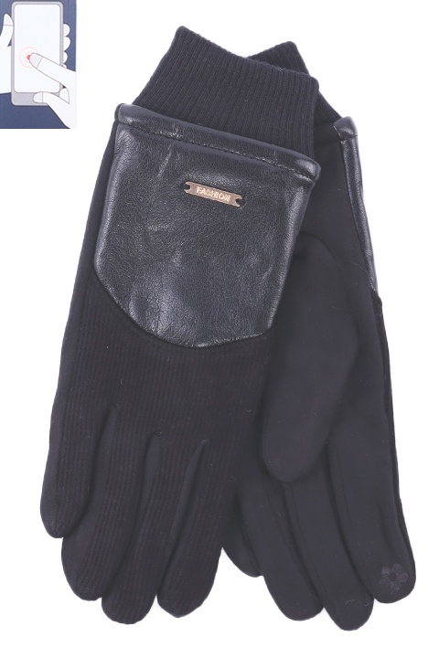 Перчатки женские сенсорные (нашивка на кончике указательного пальца). Комбинированные: ладонь иск.замша на велюровой основе. Сверху - трикотаж на подкладе велюр и вставка из эко-кожи.