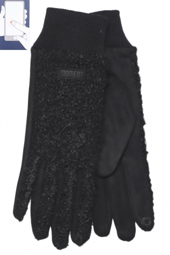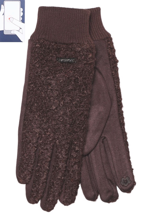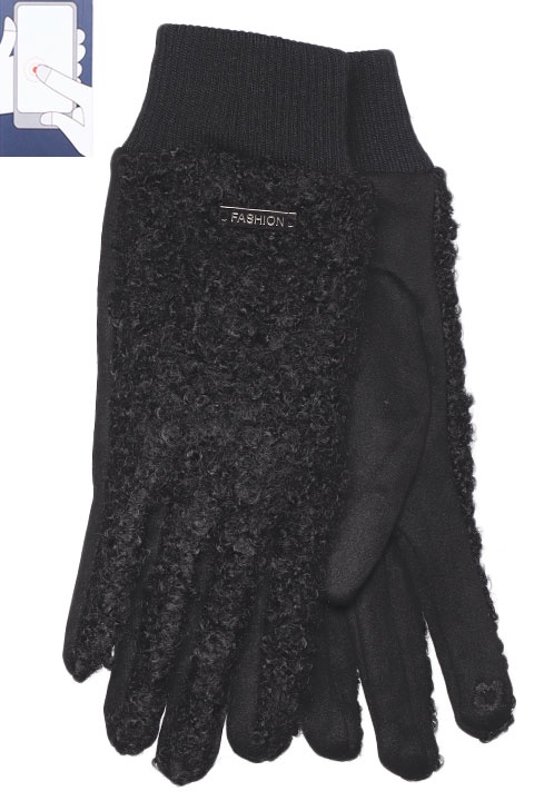 Перчатки сенсорные (нашивка на кончике указательного пальца). Комбинированные: ладонь иск.замша на велюровой основе, сверху - плотная, мягкая ткань "букле". Трикотажный манжет, шириной 4,5 см.
