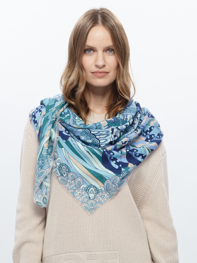 Платок женский торговой марки ELEGANZZA. Состав: 50% шелк, 30% шерсть, 20% модал. Тип подгибки: реснички. Размер: 120х120см.