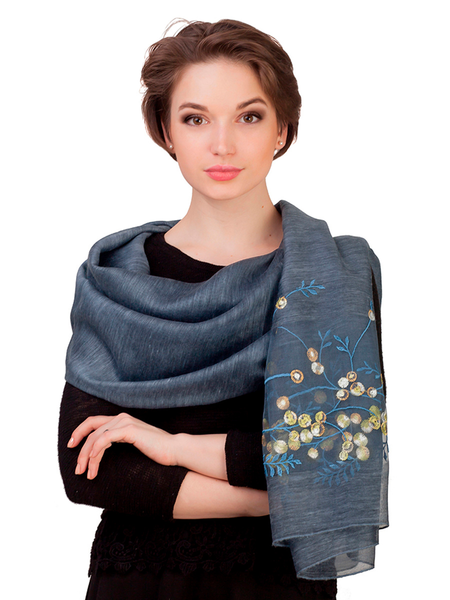 Уникальный своим дизайном воздушный палантин не останется без внимания и удачно дополнит как элегантный вечерний образ, так и легкий стильный дневной наряд. Палантин выполнен из тончайшего, нежного шёлка и шерсти с использованием исключительной технологии обработки материала, что позволяет на себе ощутить необычайную мягкость и невесомость этих натуральных тканей. Удачная комбинация материалов и специальная окраска волокон позволили сохранить естественный блеск шёлка, и задать глубокую, но мягкую цветовую гамму шерсти, цветочная вышивка по краям изделия добавляет романтичности изделию!