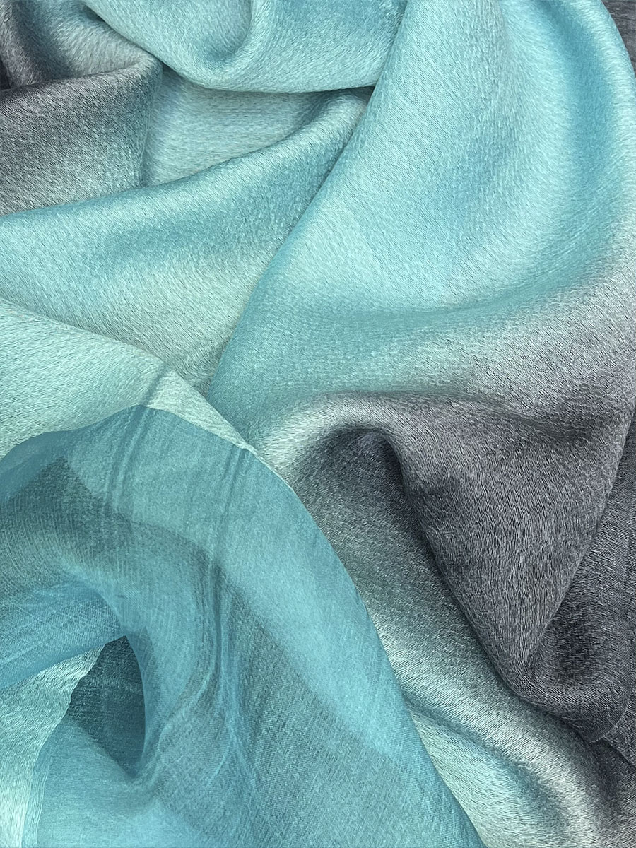 Удачная комбинация материалов и уникальное переплетение волокон создают невероятный эффект естественный блеск шёлка комбинируется с глубоким, но мягким цветом шерсти. Сплетение шерстяной и шелковой нити выполнено оригинальным волнистым орнаментом. Секции палантина из натурального шелка, расположенные вблизи края палантина, скомбинированы с основой палантина из шерсти и шелка.