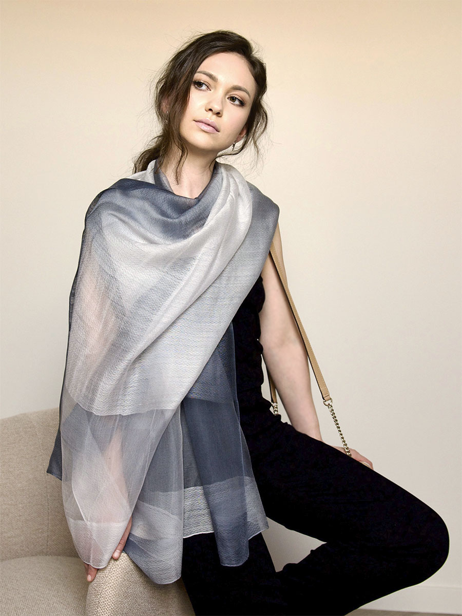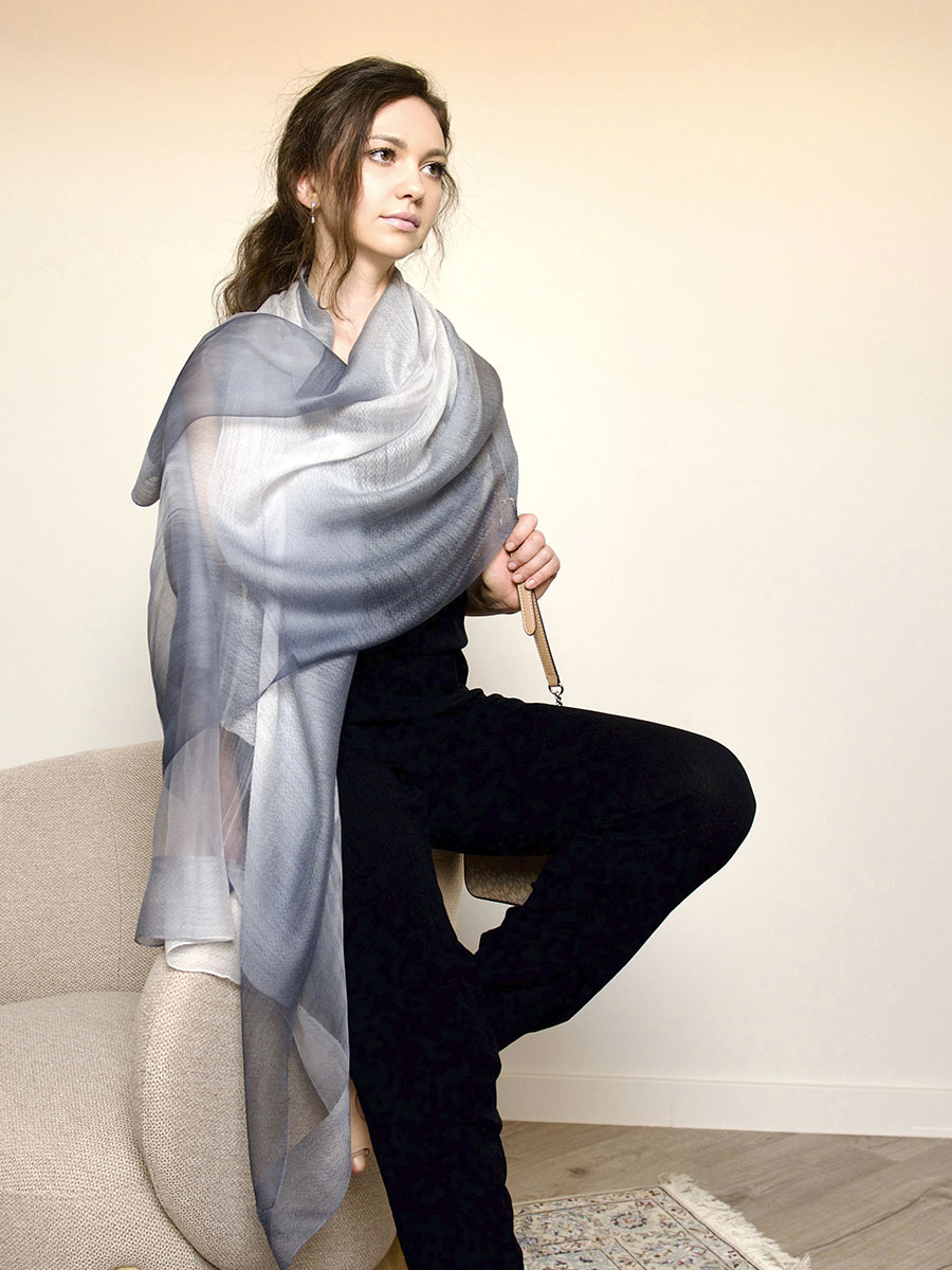 Удачная комбинация материалов и уникальное переплетение волокон создают невероятный эффект естественный блеск шёлка комбинируется с глубоким, но мягким цветом шерсти. Сплетение шерстяной и шелковой нити выполнено оригинальным волнистым орнаментом. Секции палантина из натурального шелка, расположенные вблизи края палантина, скомбинированы с основой палантина из шерсти и шелка.