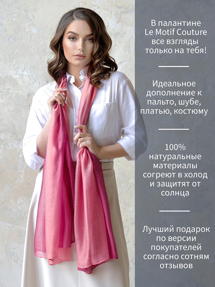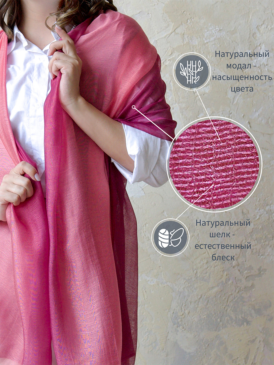 Яркий, привлекательный палантин из высококачественного шёлка с добавлением натурального модала создан на основе бестселлера, коллекции «Шёлковый путь» Этот стильный аксессуар сделает ваш образ еще более женственным и элегантным, а легкая, воздушная текстура ткани подарит ощущение необычайного комфорта. Уникальная цветовая палитра палантина с переходом цвета подчеркнет вашу индивидуальность и выделит среди остальных. С таким аксессуаром вы всегда будете чувствовать себя уверенно и останетесь довольны тем, как вы выглядите.
