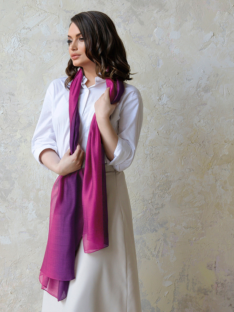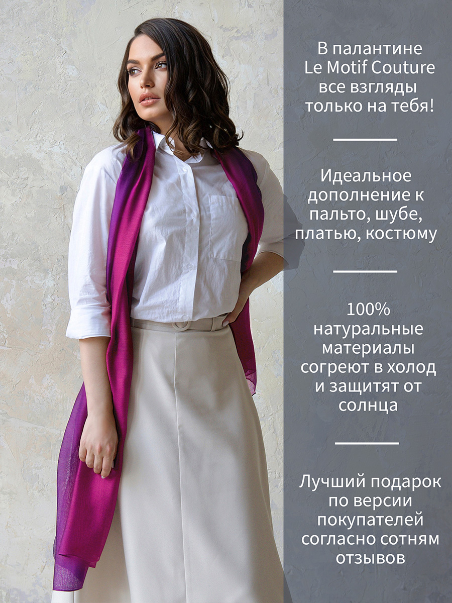 Яркий, привлекательный палантин из высококачественного шёлка с добавлением натурального модала создан на основе бестселлера, коллекции «Шёлковый путь» Этот стильный аксессуар сделает ваш образ еще более женственным и элегантным, а легкая, воздушная текстура ткани подарит ощущение необычайного комфорта. Уникальная цветовая палитра палантина с переходом цвета подчеркнет вашу индивидуальность и выделит среди остальных. С таким аксессуаром вы всегда будете чувствовать себя уверенно и останетесь довольны тем, как вы выглядите.