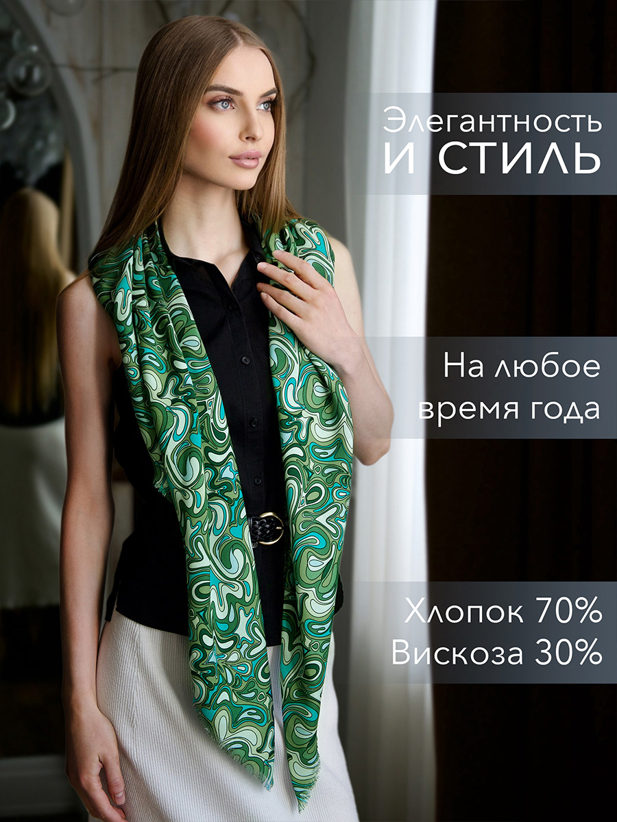 Оригинальный платок из качественного хлопка и вискозы, нежный и мягкий на ощупь, гармонично подойдет для любого образа, а необычный принт, изображающий цветочный орнамент, придаст обворожительности и притягательности вашему наряду. Большой размер платка позволяет завязывать его множеством вариантов, что делает вас неповторимой и привлекательной, а легкий струящийся материал будет ежедневно дарить ощущение комфорта и уюта.