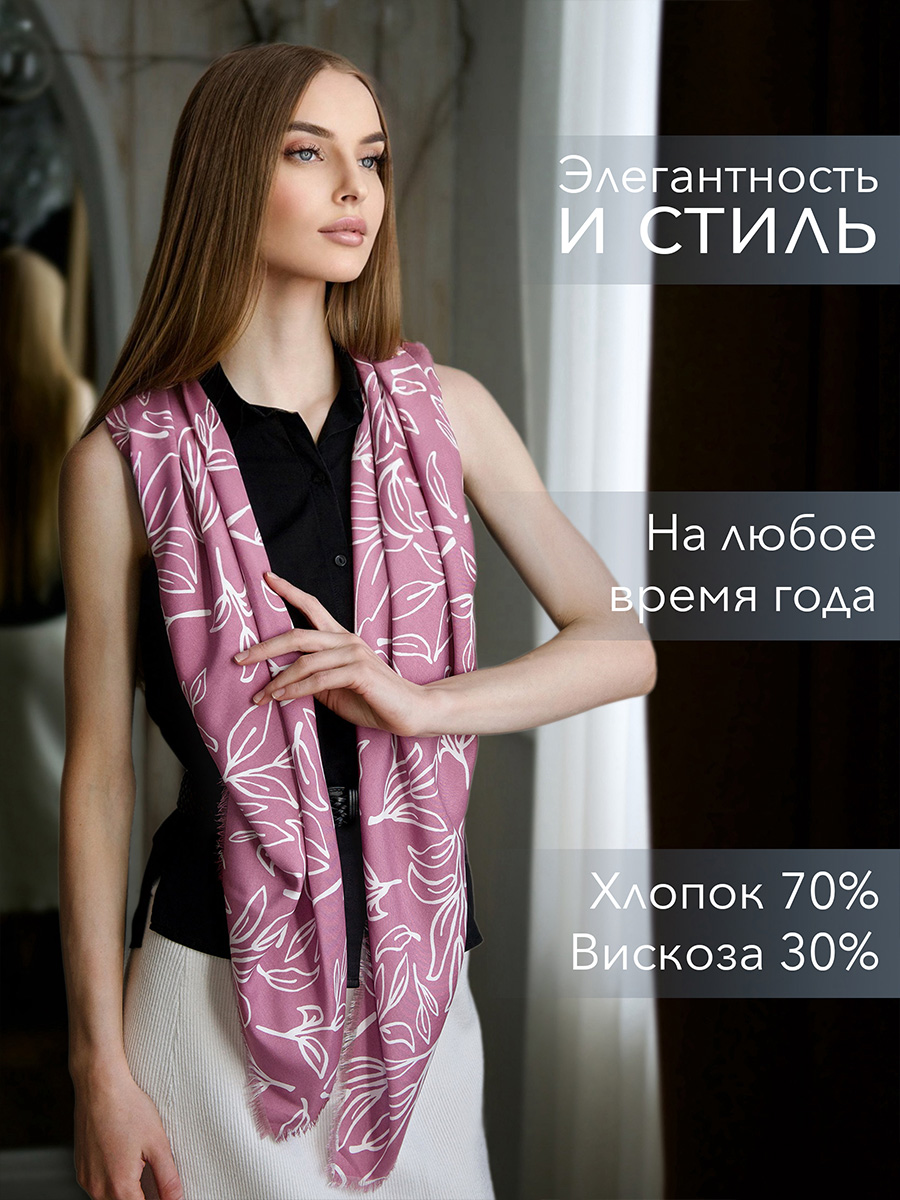 Оригинальный платок из качественного хлопка и вискозы, нежный и мягкий на ощупь, гармонично подойдет для любого образа, а необычный принт, изображающий цветочный орнамент, придаст обворожительности и притягательности вашему наряду. Большой размер платка позволяет завязывать его множеством вариантов, что делает вас неповторимой и привлекательной, а легкий струящийся материал будет ежедневно дарить ощущение комфорта и уюта.