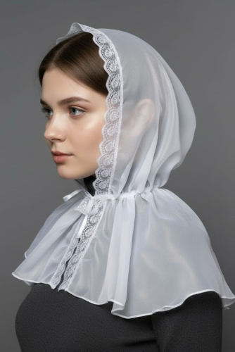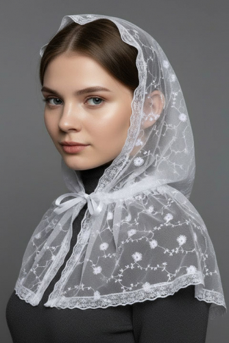 Накидка-капюшон выполнена из гипюра, по краю окантована кружевной лентой.