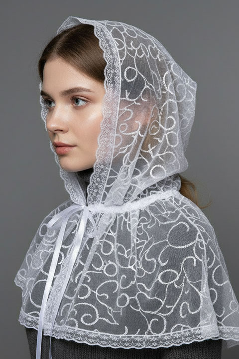 Накидка-капюшон выполнена из гипюра, по краю окантована кружевной лентой.