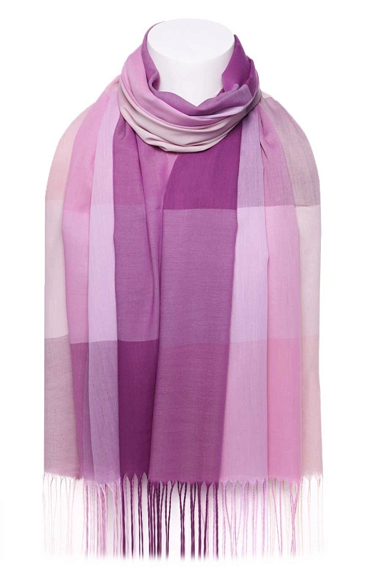 Тонкий, шелковистый палантин в крупную клетку. Края палантина заканчиваются кромкой, концы - бахрома.