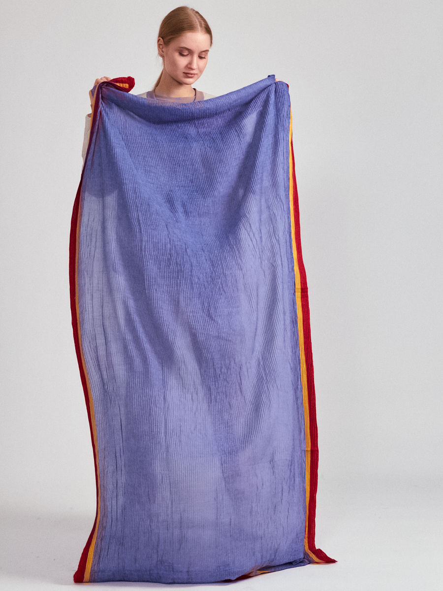 Большой, однотонный палантин из жатого полотна. Края палантина украшены двойной косой бейкой. Только ручная стирка.