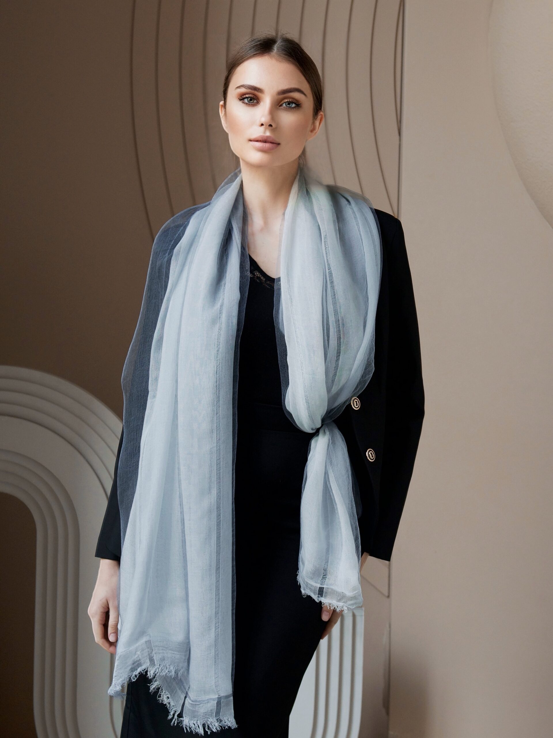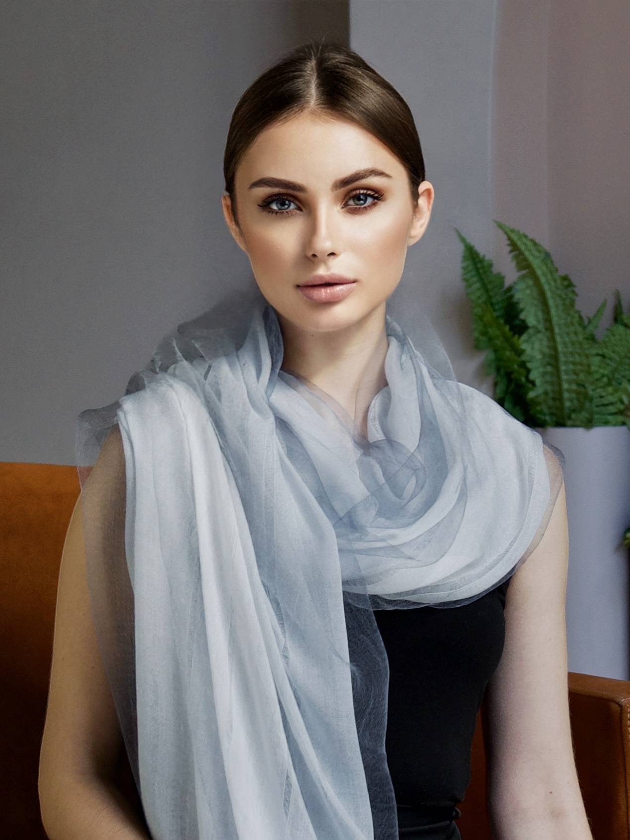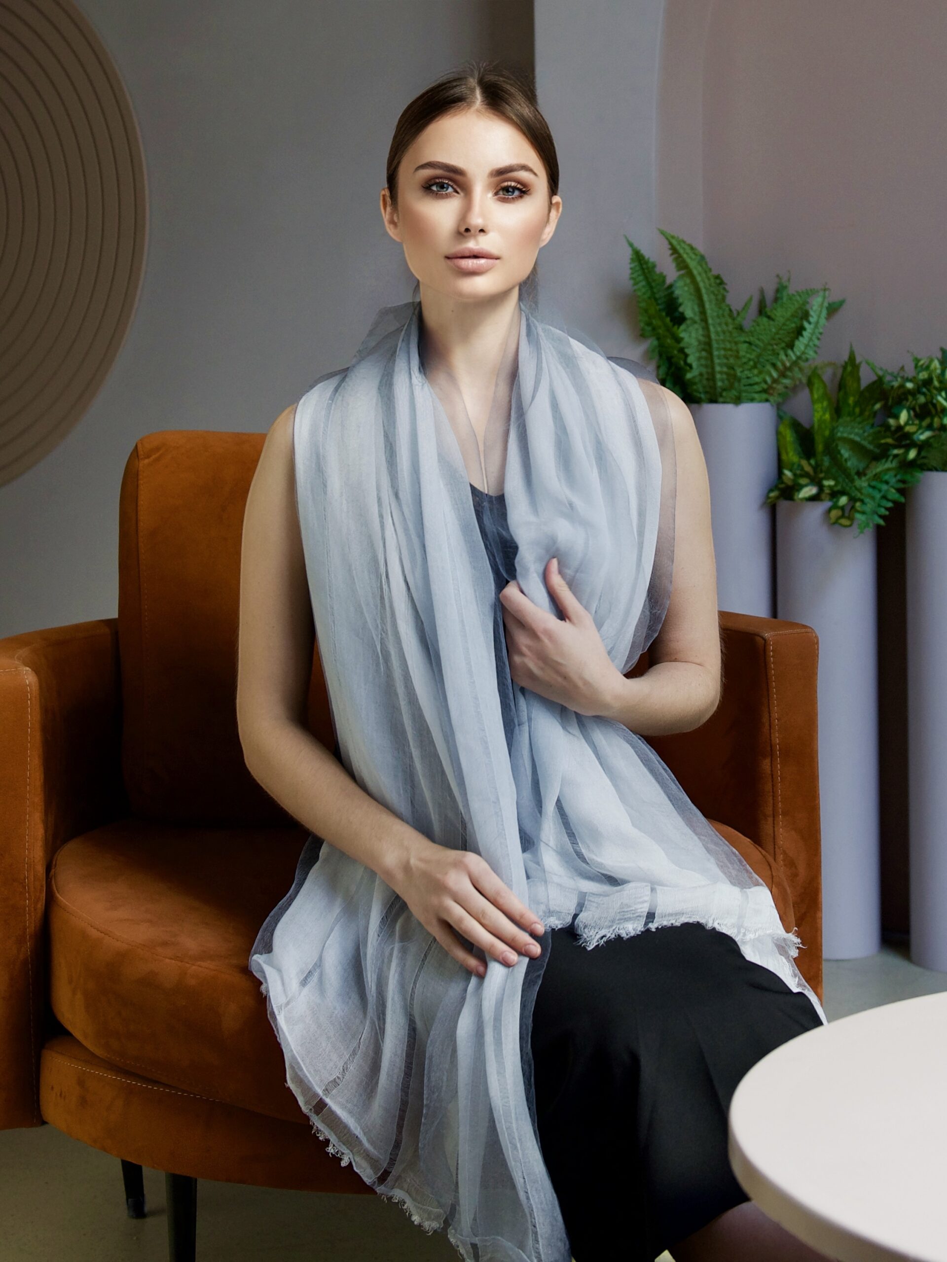 Уникальный своим дизайном двухслойный воздушный палантин не останется без внимания и удачно дополнит как элегантный вечерний образ, так и стильный дневной наряд. Палантин выполнен из нежного шёлка и мягкой вискозы, с использованием исключительной технологии обработки материалов, что позволяет на себе ощутить необычайную невесомость этих тканей. Удачная комбинация материалов и специальная окраска волокон позволили сохранить естественный блеск шёлка и задать глубокую, но мягкую цветовую гамму вискозы с переходом цвета, которая подчеркнет вашу индивидуальность и выделит среди остальных.