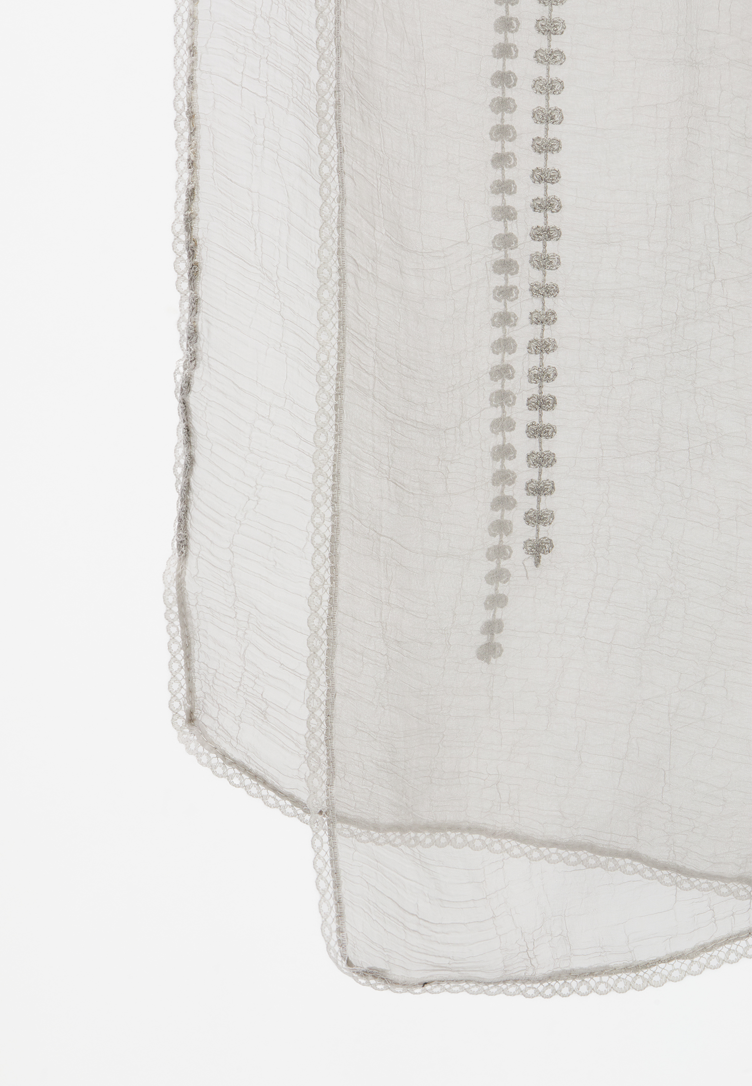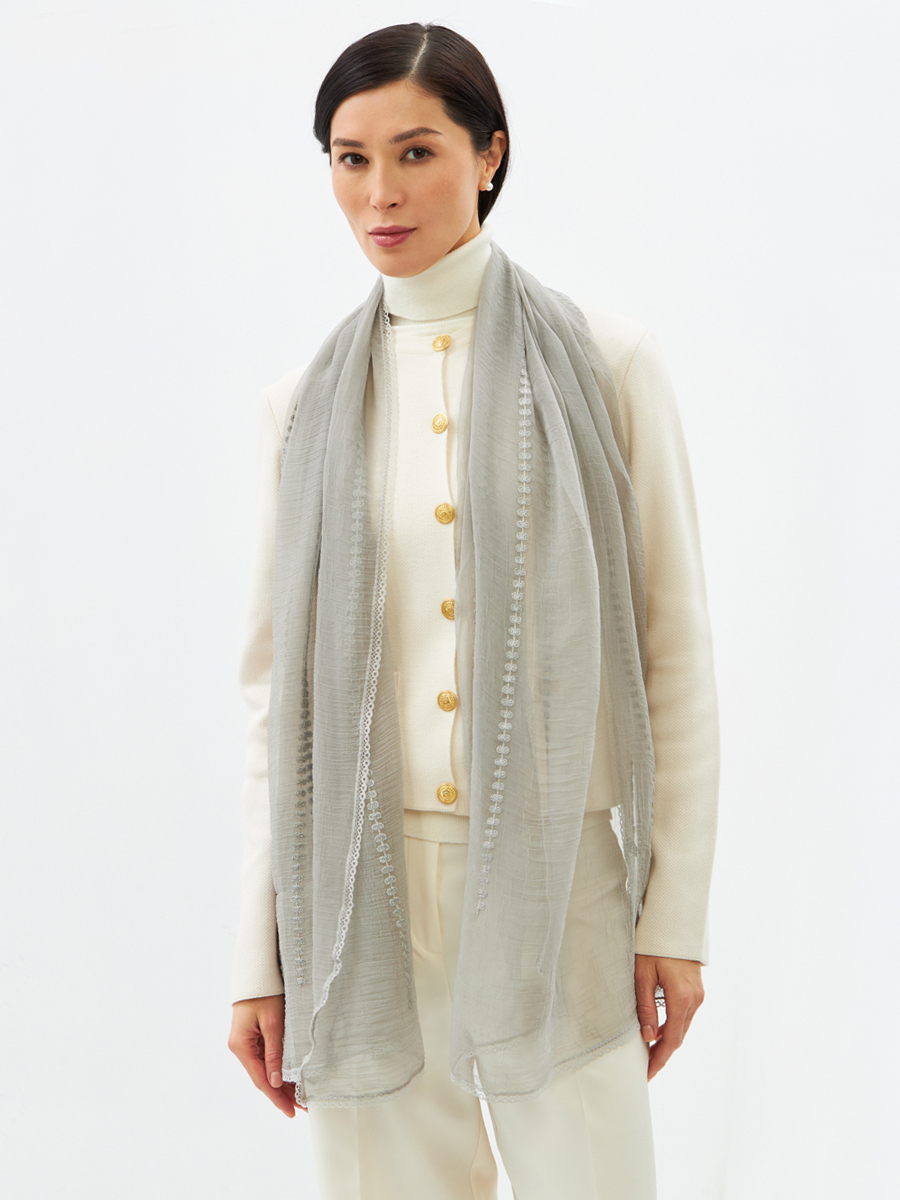 Создан из невесомого жатого шифона. Его двусторонний дизайн и вышивка в стиле "арт-деко" придают аксессуару уникальность и соответствие модным тенденциям. Аккуратно обработанные края подчеркивают наше мастерство.