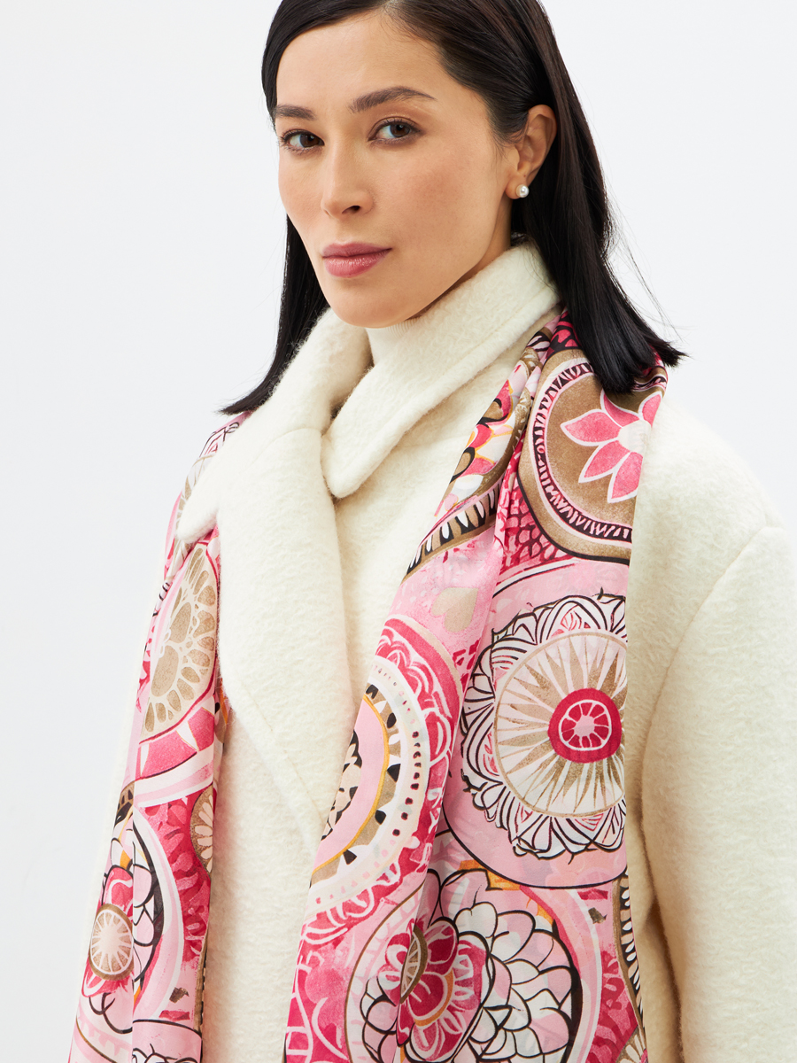 Большой, красивый двусторонний палантин с рисунком в стиле "арт-деко" и атласной текстурой ткани. Края изделия аккуратно обработаны. Машинная деликатная стирка.