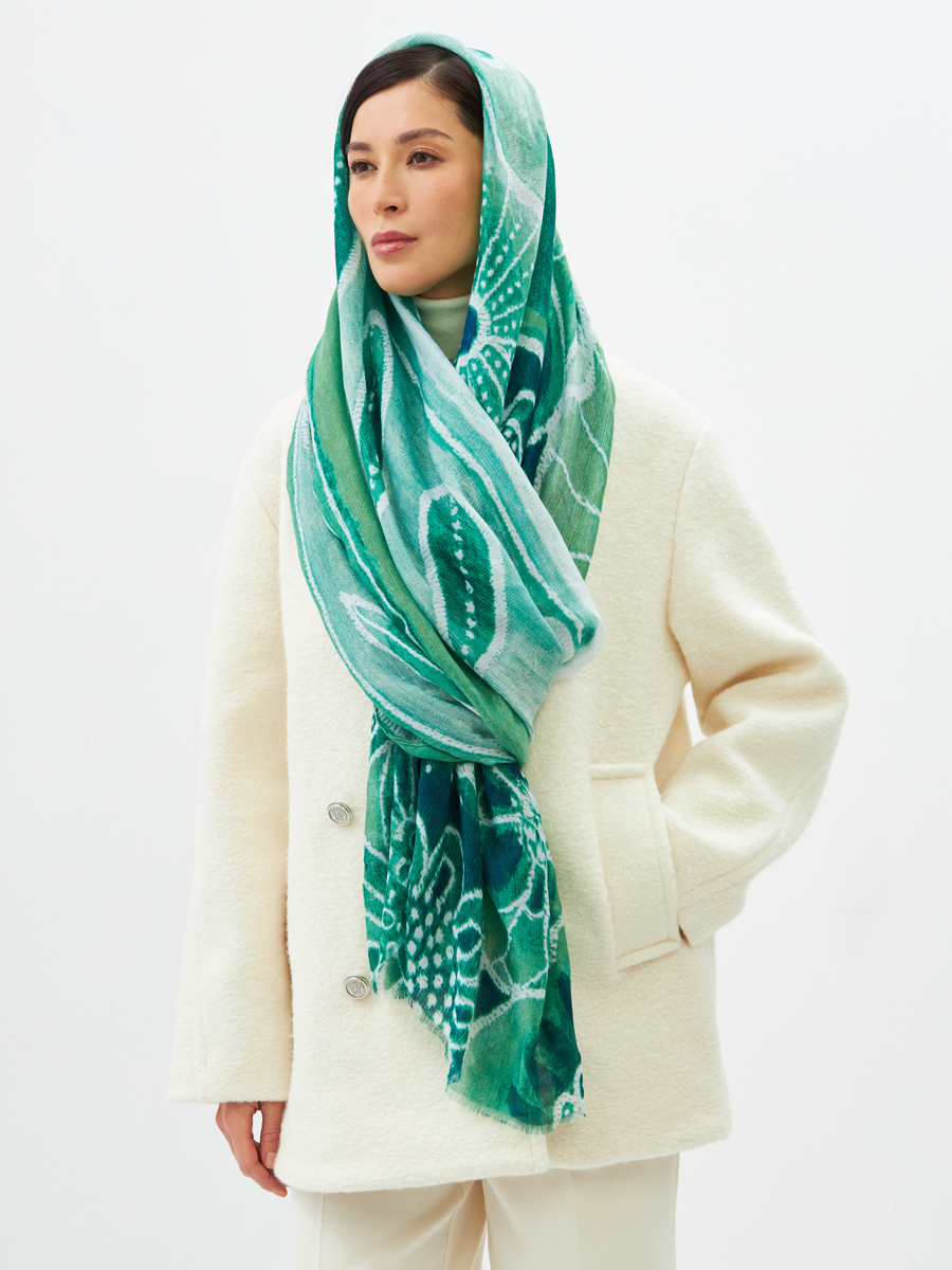 Большой, красивый двусторонний палантин с рисунком в стиле "арт-деко" и очень мягкой и нежной текстурой ткани. Края изделия аккуратно обработаны. Машинная деликатная стирка.