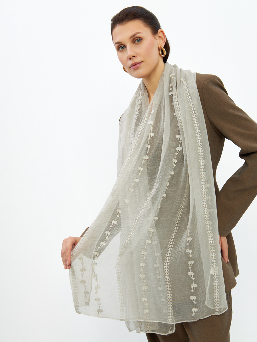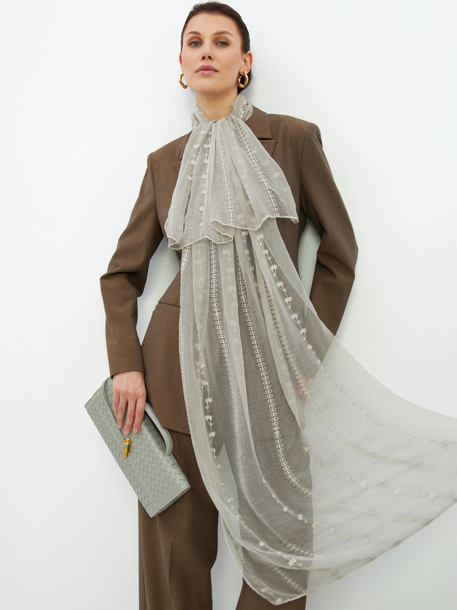 Представляем элегантный двусторонний палантин DRK-145-28, созданный TANTINO. Этот аксессуар, произведенный нашими мастерами, идеально дополнит ассортимент вашего бутика, привлекая ценителей изысканного стиля и высокого качества.Палантин выполнен из невесомого жатого шифона, который придает ему воздушность и утонченность. Главная особенность – эксклюзивная вышивка в стиле арт-деко, разработанная нашими дизайнерами. Этот узор создает неповторимый шарм, делая палантин идеальным дополнением как к повседневному, так и к вечернему образу.Каждая деталь продумана: аккуратная обработка краев гарантирует долговечность. Двусторонний дизайн увеличивает функциональность, предлагая покупательницам больше вариантов стилизации и повышая привлекательность продукта для оптовых закупок.Преимущества для оптовых покупателей:Полный цикл производства TANTINO: Гарантия высочайшего качества и эксклюзивности дизайна.Высокий коммерческий потенциал: Актуальный арт-деко принт и универсальность обеспечивают стабильный спрос.Легкость в уходе: Деликатная машинная стирка – важный плюс для конечного клиента.Гибкость в стилизации: Идеален для блузок, платьев, костюмов, верхней одежды.Включите палантин DRK-145-28 в свой ассортимент. Предложите клиентам не просто аксессуар, а произведение искусства, подчеркивающее индивидуальность и вкус. Сделайте оптовый заказ и увеличьте прибыльность вашего бизнеса с TANTINO.