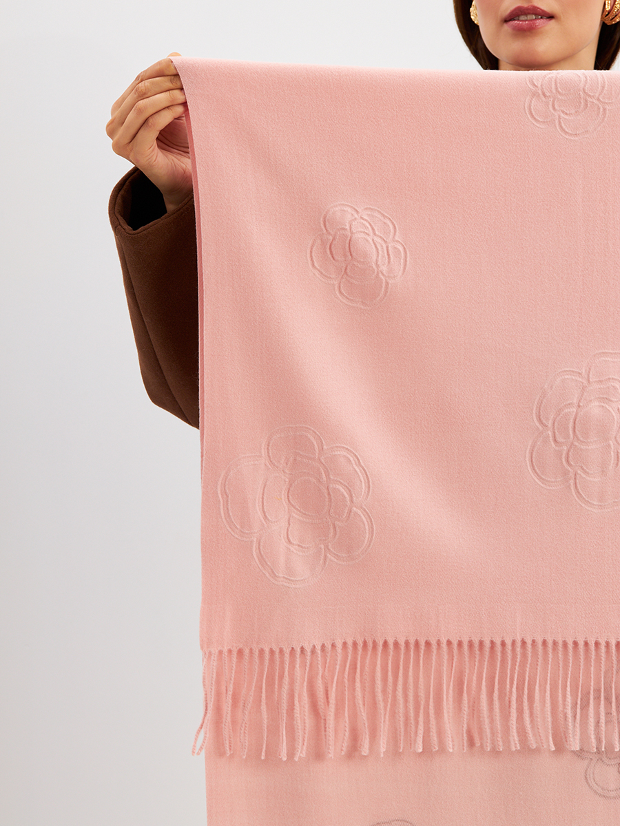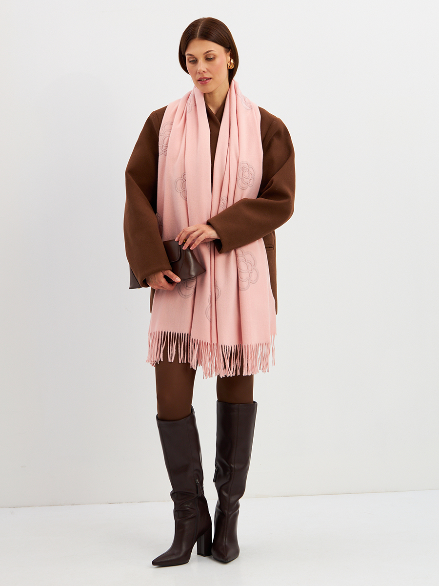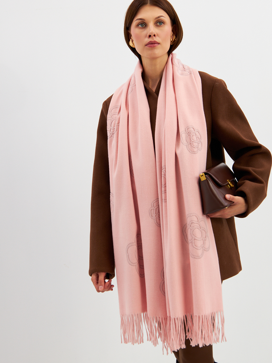 Большой, мягкий, теплый двусторонний однотонный палантин с принтом-печатью. Края изделия украшены бахромой. Машинная деликатная стирка. Кашемир 25% Шерсть 20% Вискоза 55%