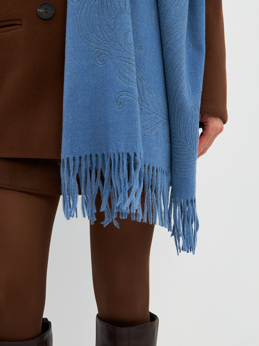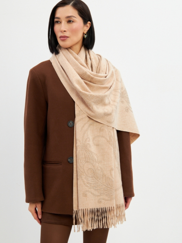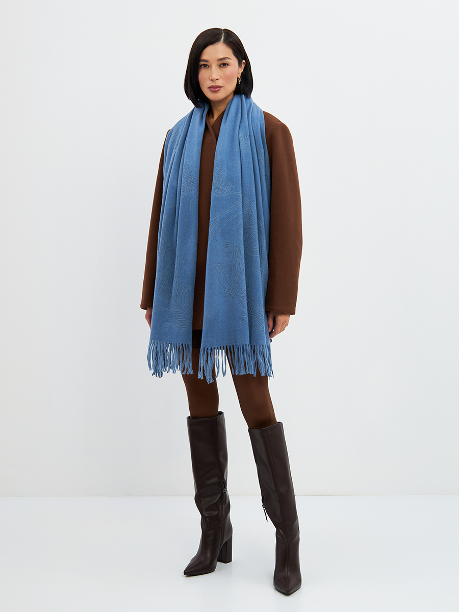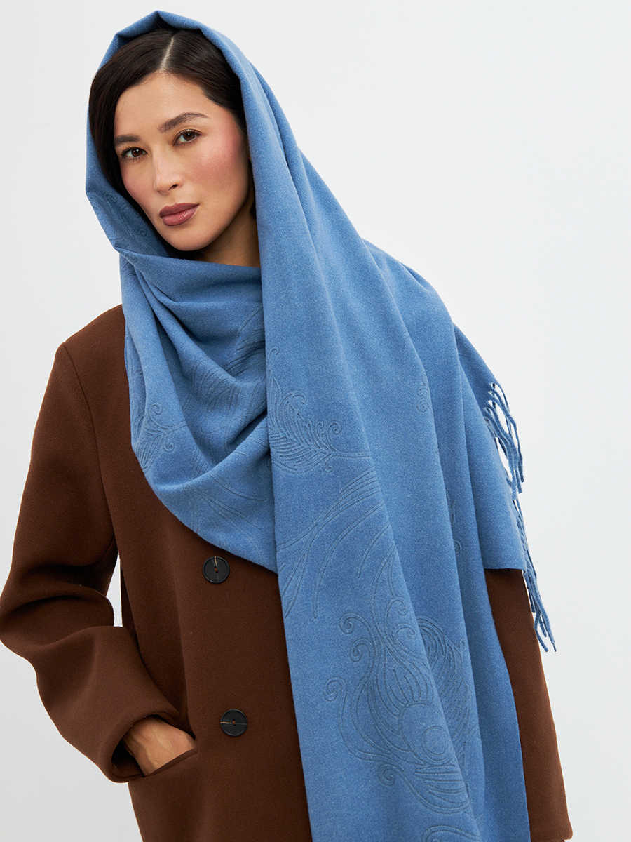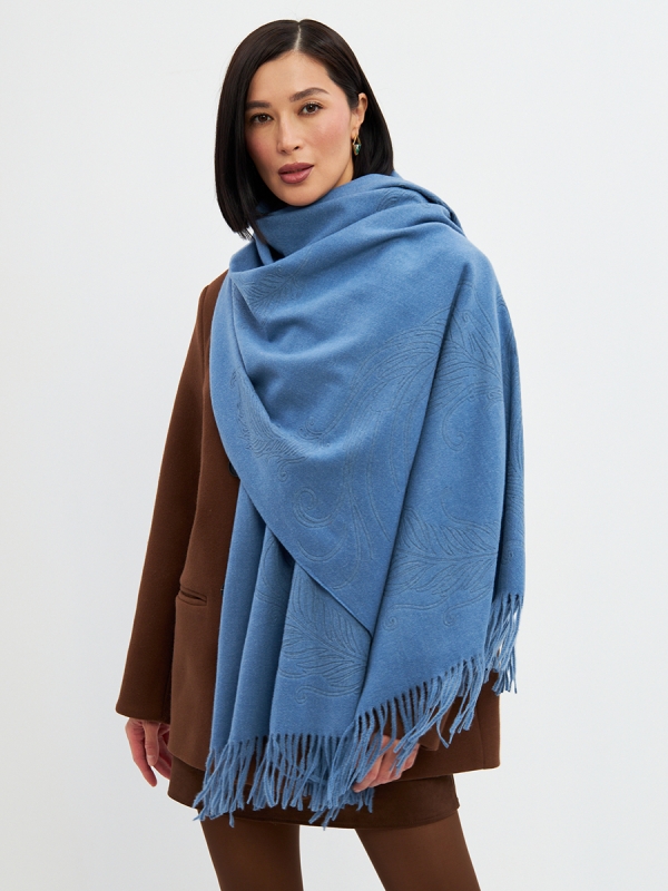 Большой, мягкий, теплый двусторонний однотонный палантин с принтом-печатью. Края изделия украшены бахромой. Машинная деликатная стирка. Кашемир 25% Шерсть 20% Вискоза 55%