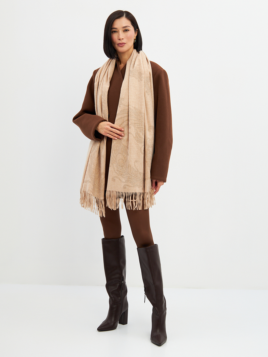 Большой, мягкий, теплый двусторонний однотонный палантин с принтом-печатью. Края изделия украшены бахромой. Машинная деликатная стирка. Кашемир 25% Шерсть 20% Вискоза 55%