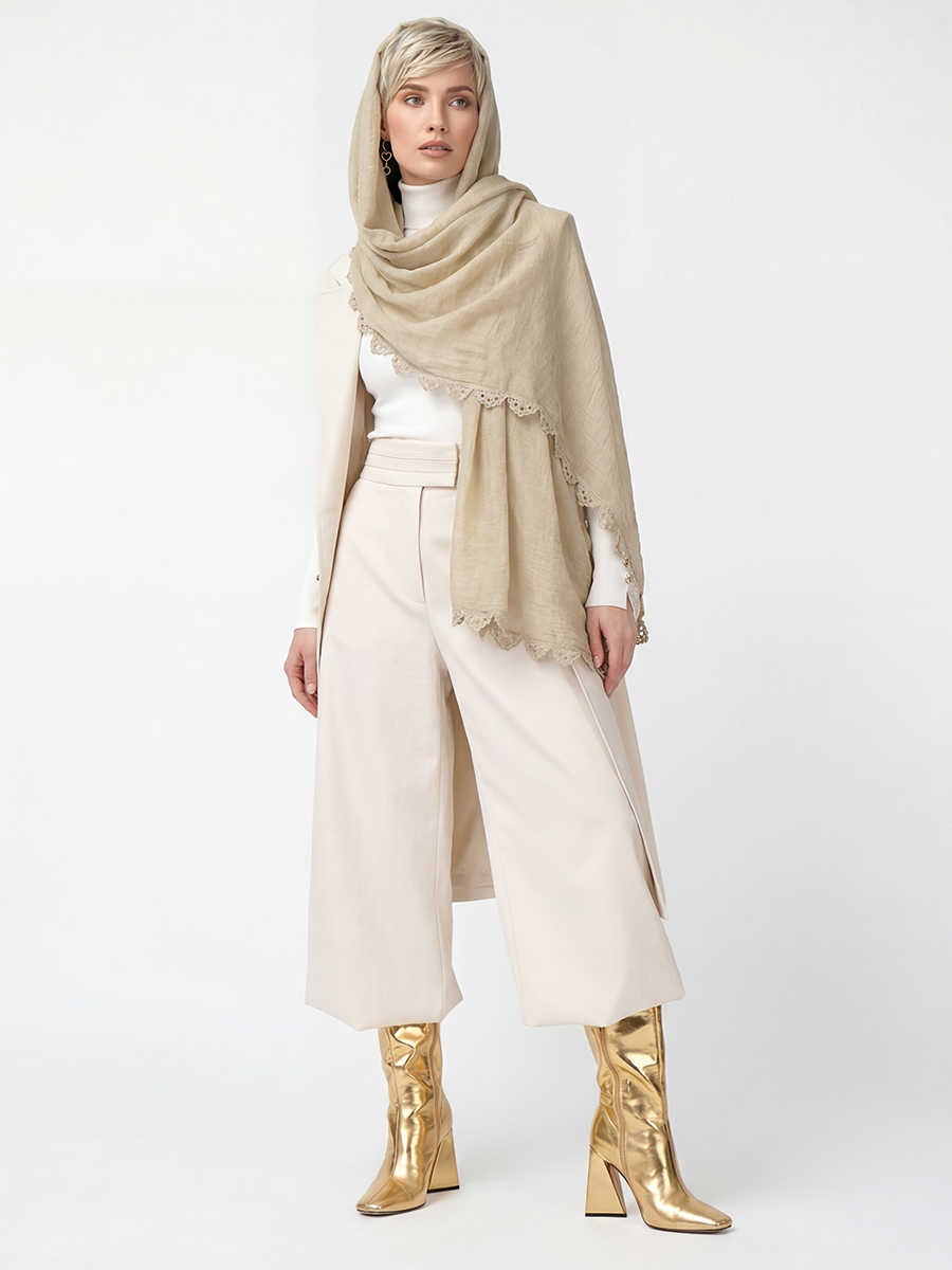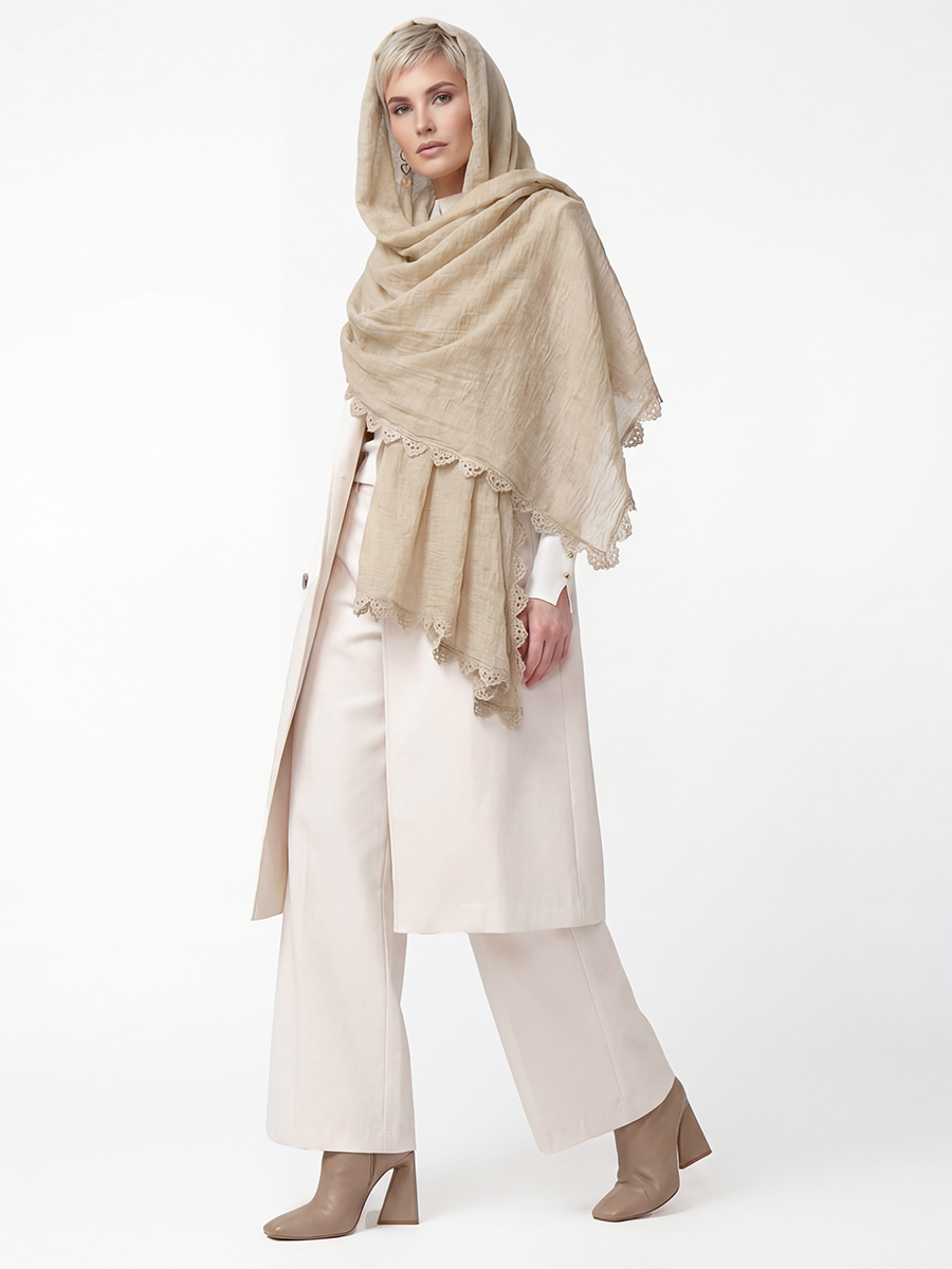 Изысканный дизайн: Палантин выполнен из тонкой, мягкой ткани приятного бежевого оттенка с благородной жатой текстурой. Деликатный кружевной кант по краю придает изделию женственности и утонченности.