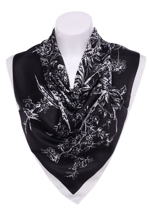 Легкий платок из мягкого искусственного шелка с принтом. Обработка кромки-подрубка.