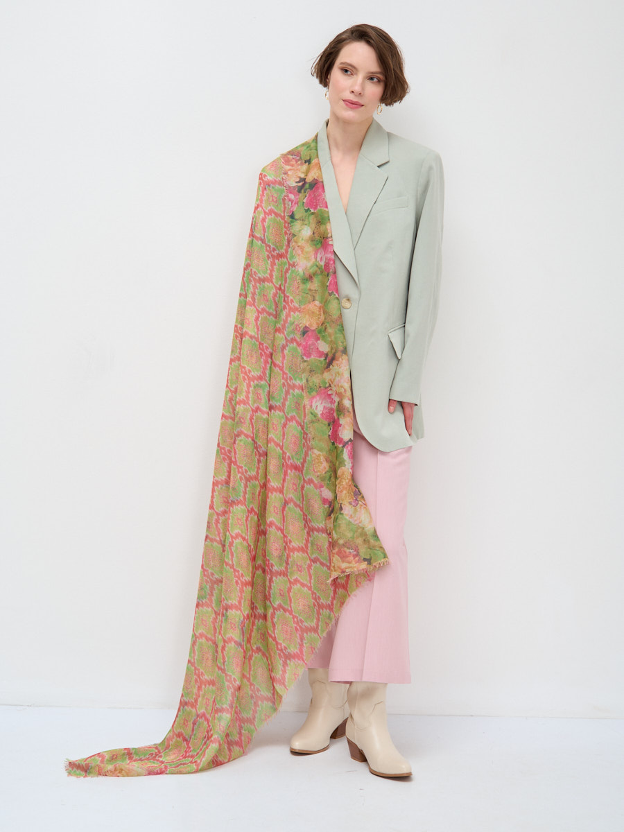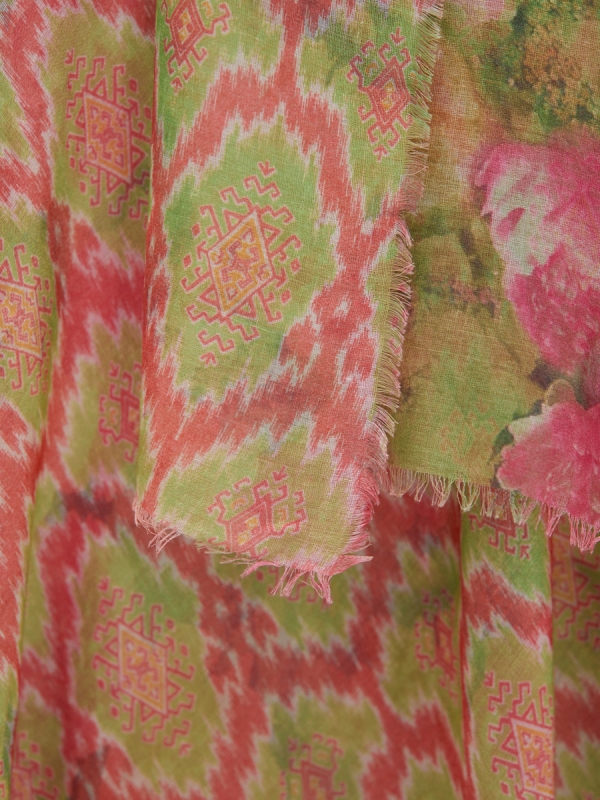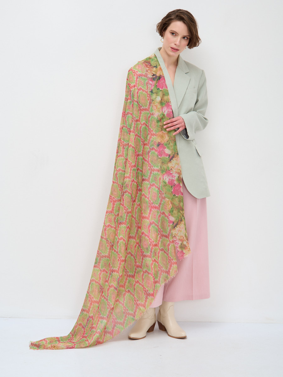 Оригинальный двусторонний платок.Обработка края-бахрома. На лицевую и изнаночную сторону изделия нанесен разный рисунок. Только ручная стирка.