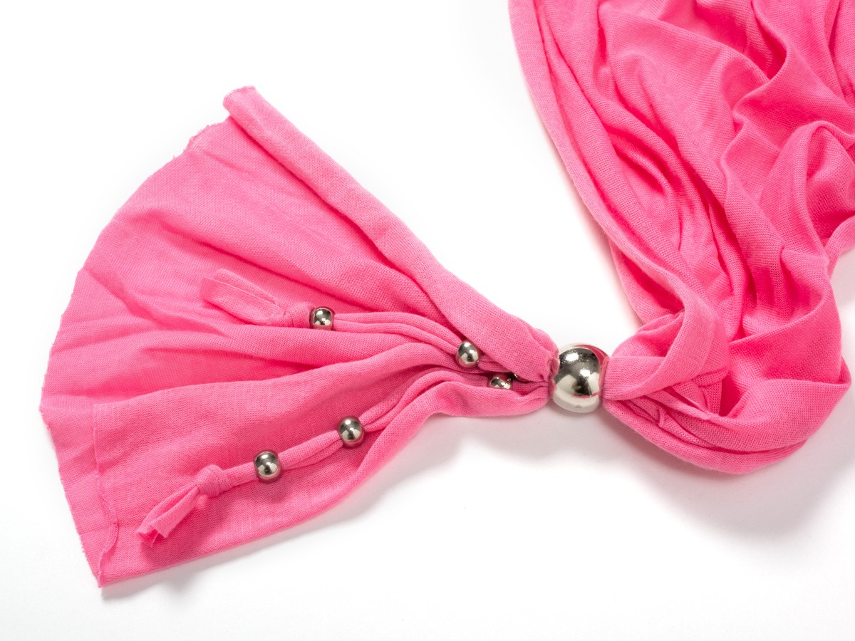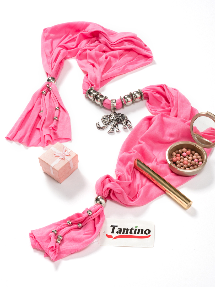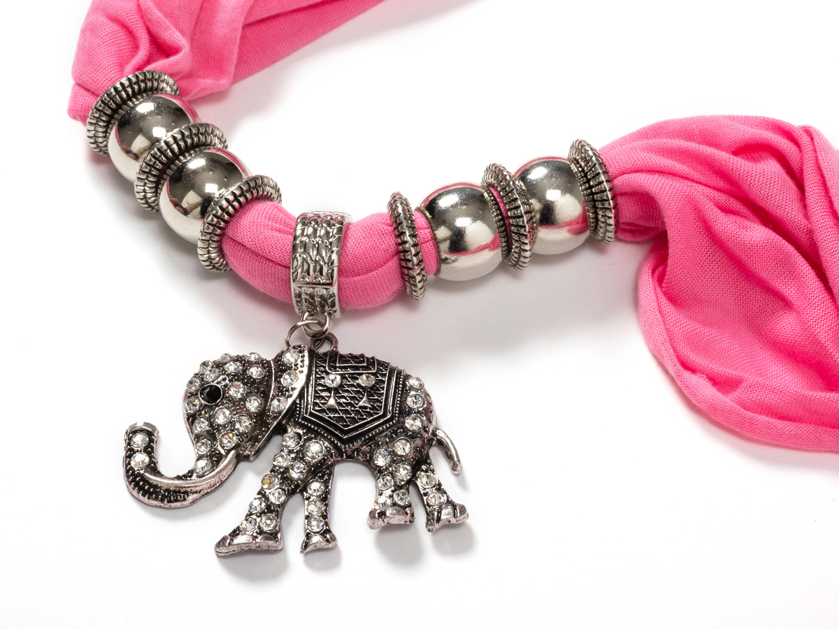 По центру изделие украшает крупный кулон в виде слоника из бижутерного сплава, декорированного стразами. По всей длине шарф украшен металлическими бусинами-шармами. Все шармы съемные и взаимозаменяемые.