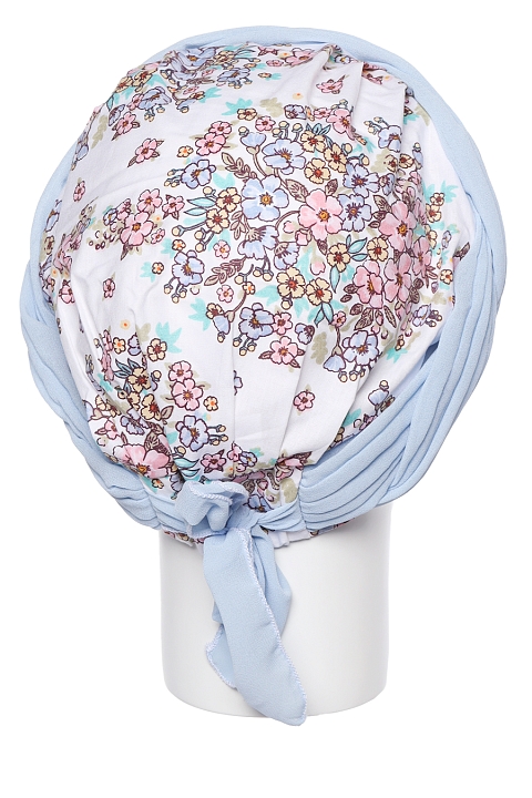 Шапка летняя выполнена из хлопковой ткани и украшена вставками из шифона (принт в ассортименте, смотрите фото). Модель собрана на резинке в затылочной части + ленты-завязки для регулировки размера. Принт у шапок разный, смортите фото.