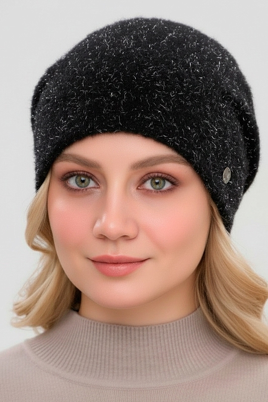 Женский колпак двойной выполнен из мягкой пряжи  "Angora"с добавлением нити люрекса и пряжи "травка". Вязка плотная, эластичная.