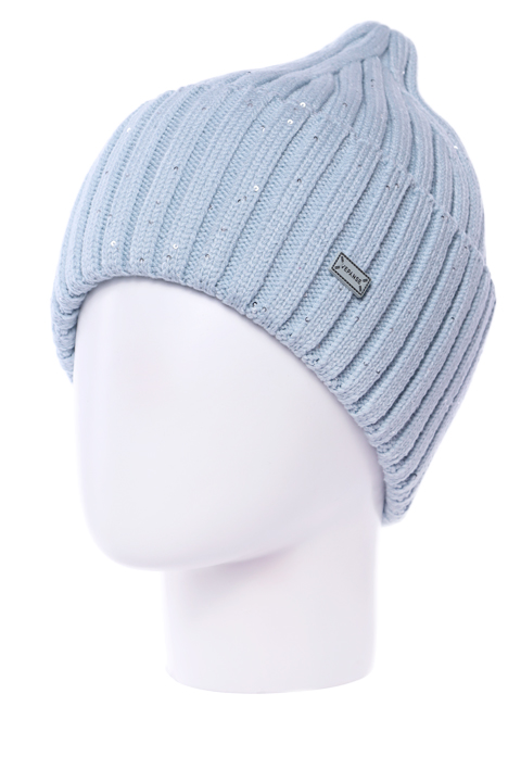 Шапка одинарная с отворотом, выполнена из эластичной пряжи с пайетками.